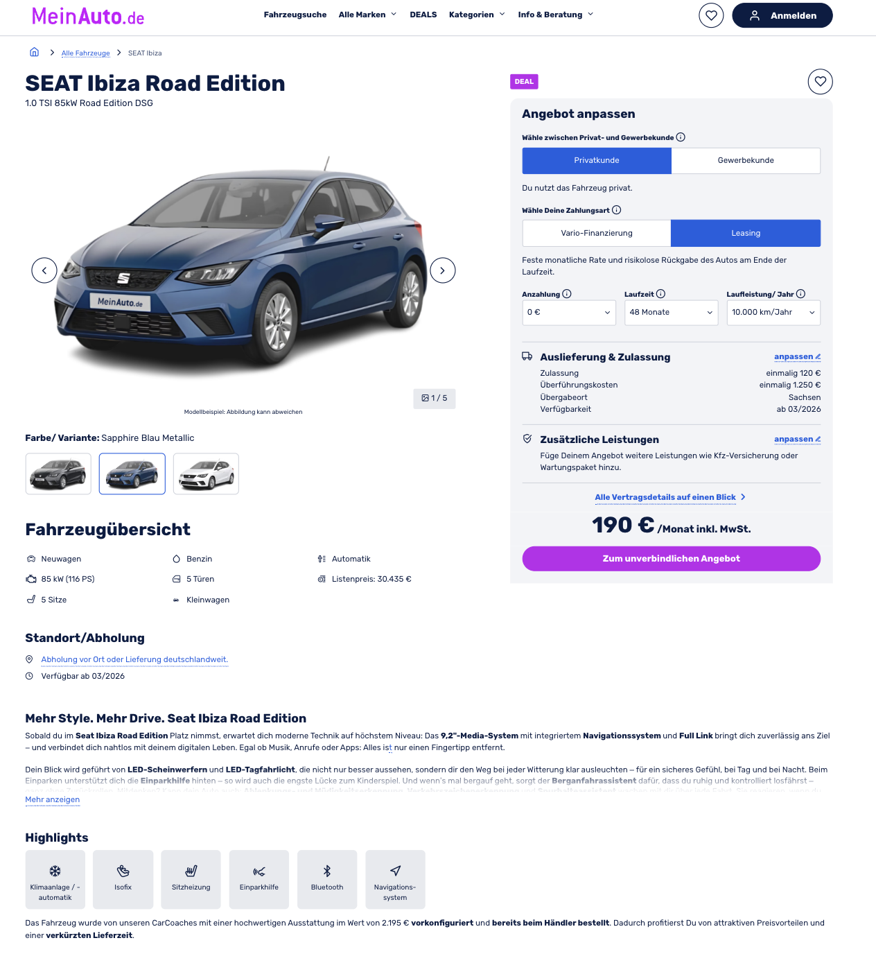 Kompakter Begleiter für Pendelstrecken und Stadtverkehr, Seat Ibiza 1.0 TSI 85 kW DSG Road Edition bei MeinAuto für 190 Euro im Monat brutto leasen. Es handelt sich um ein bereits bestelltes Fahrzeug, das ab März 2026 verfügbar sein soll. Zur Auswahl stehen Magnetic Grau Metallic, Sapphire Blau Metallic und Glacial White Metallic. Wer jetzt plant, bekommt damit einen klar kalkulierbaren Kleinwagen mit Automatik, ohne sich durch komplizierte Ausstattungslisten kämpfen zu müssen.