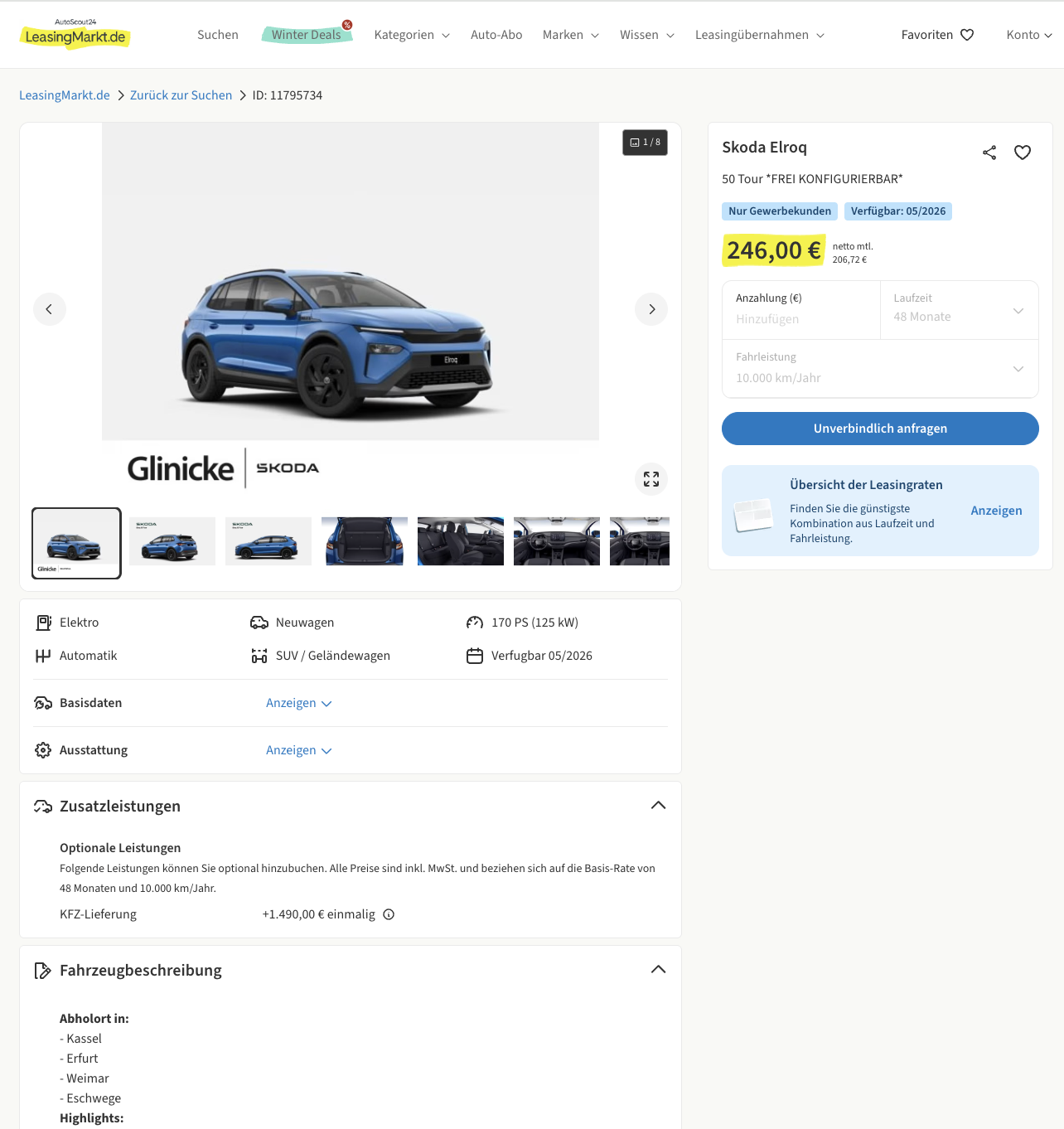 Die Kalkulation bei LeasingMarkt basiert auf 48 Monaten Laufzeit und 10.000 Kilometern pro Jahr, Anpassungen sind möglich. Für den Škoda Elroq 50 ruft der Platzhirsch aktuell 379 Euro brutto pro Monat auf, hier stehen 249 Euro brutto in den Unterlagen. Damit spart ihr rund 130 Euro pro Monat und bekommt ein vollelektrisches Kompakt SUV mit viel Raum, guter Serienausstattung und einem Antrieb, der den Alltag leise und effizient abdeckt.