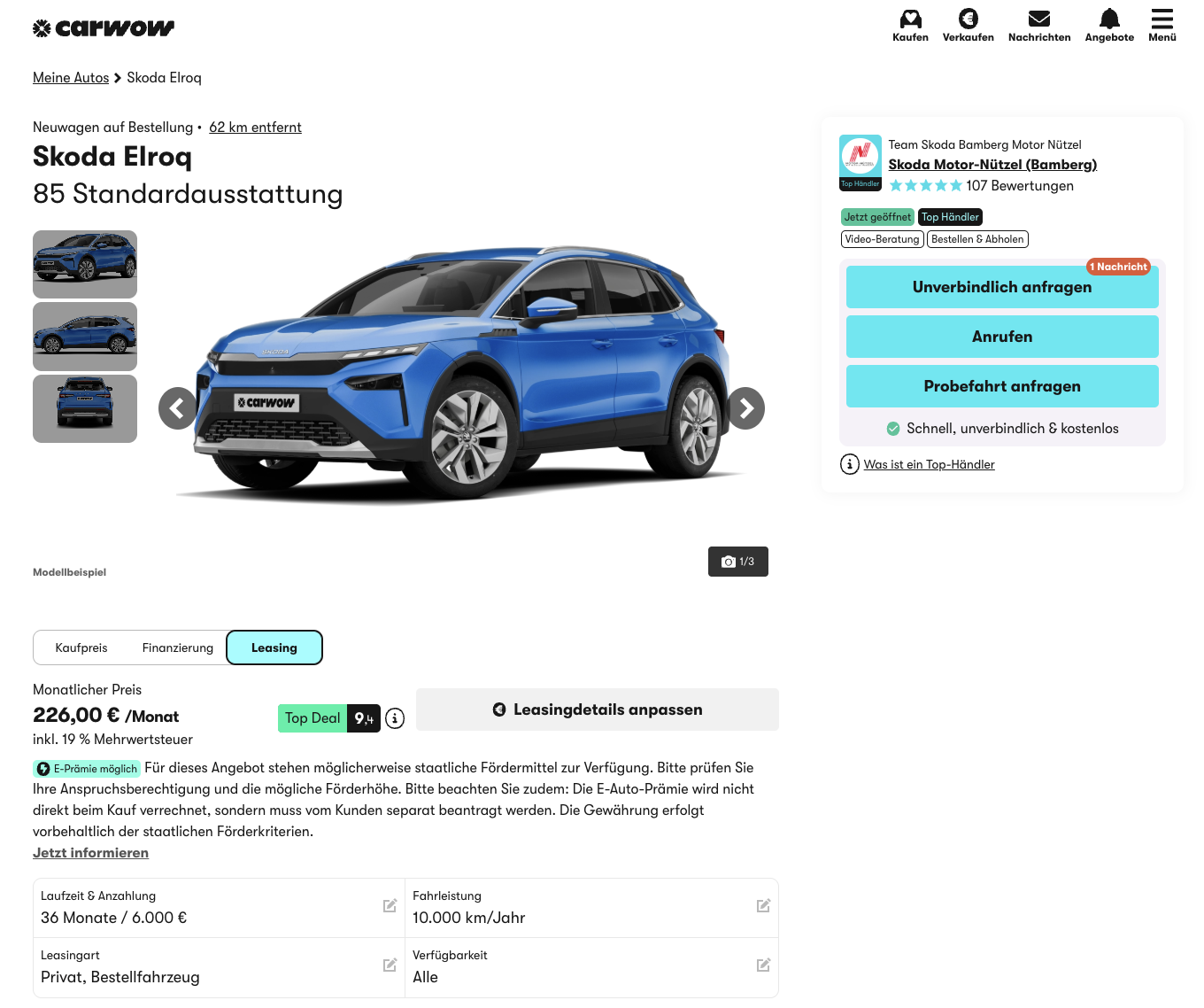 Škoda Elroq im Leasing als Bestellfahrzeug für 226 [393] Euro im Monat brutto [Umwelt]