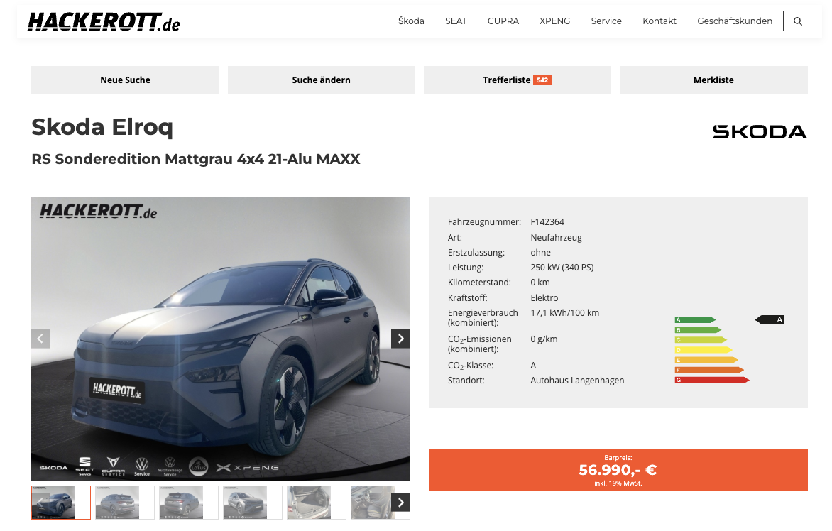 Elektrisch unterwegs sein und dabei nicht auf Leistung verzichten. Škoda Elroq RS bei Hackerott für 56.990 Euro brutto kombiniert genau diese beiden Ansätze. Der verfügbare Neuwagen steht in Stahl Grau Uni bereit und richtet sich an alle, die ein kompaktes SUV mit klar sportlicher Ausrichtung suchen.