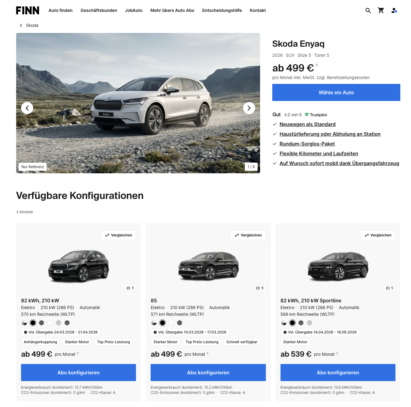 Der Enyaq ist genau die Art Elektro-SUV, die nicht nur auf dem Papier überzeugt. Viel Platz, ein ruhiger Charakter auf der Straße und eine Reichweite, die auch längere Strecken nicht zur Planungsshow macht. Škoda Enyaq 82 kWh, 210 kW bei FINN im All inclusive Auto Abo für 499 Euro brutto pro Monat ist dabei vor allem deshalb interessant, weil das Paket die laufenden Standardthemen bereits abräumt. Zulassung, TÜV, Inspektionen, Verschleiß und Reifenwechsel sind in der Rate enthalten, nur der Strom wird selbst bezahlt. Für die Organisation bleibt wenig übrig, Lieferung bis zur Haustür oder Abholung an einer Station ist möglich, die Verfügbarkeit ist konkret, lieferbar zwischen dem 24.03.2026 und 21.04.2026.