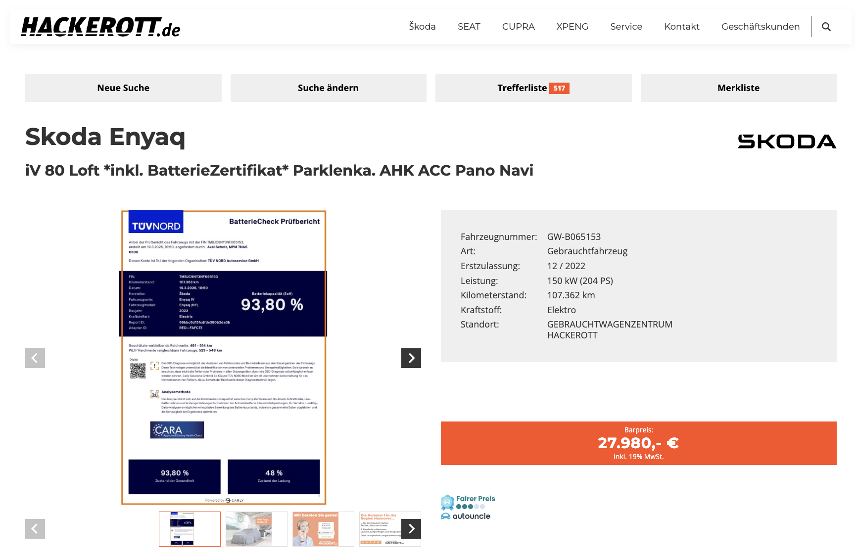 Gebrauchter Elektro-Skoda mit viel Reichweite und noch mehr Raum. Der Škoda Enyaq iV 80 Loft bei Hackerott für 27.980 Euro ist ein Angebot für alle, die in die elektrische SUV-Klasse einsteigen möchten, ohne gleich auf Neuwagenniveau investieren zu müssen. Das Modell wurde im Dezember 2022 erstzugelassen, präsentiert sich in Blau und bringt bereits 107.362 Kilometer Laufleistung mit. Genau das macht den Preis interessant, denn hier steht kein nacktes Einstiegsmodell, sondern ein großzügig geschnittenes E-SUV mit solider Reichweite, viel Platz und einer Ausstattung, die den Alltag spürbar angenehmer macht.