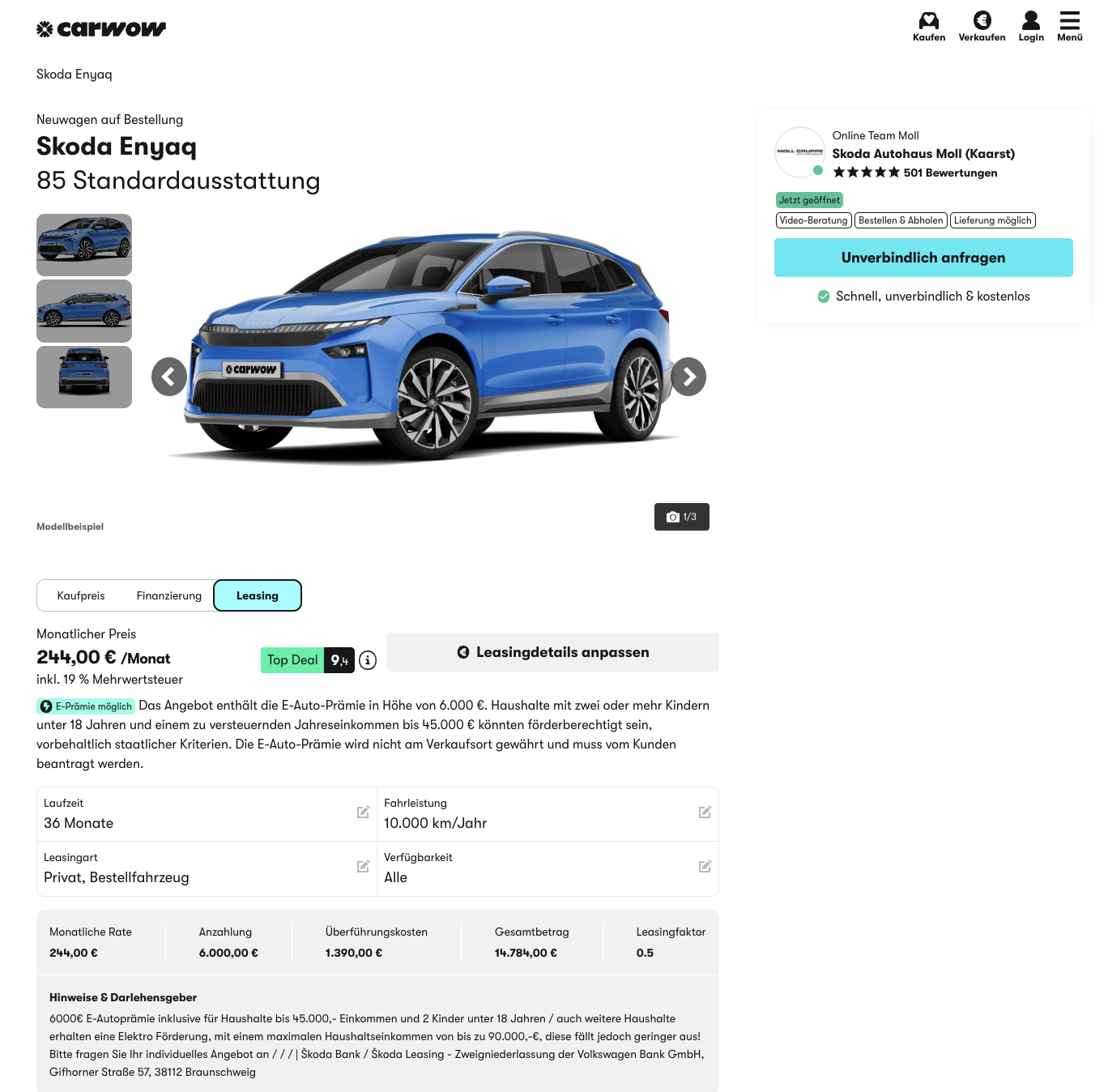 Der Škoda Enyaq richtet sich an alle, die den Umstieg auf Elektromobilität strukturiert und ohne Experimente angehen möchten. Privatkunden können den Škoda Enyaq 85 bei carwow für 244 Euro brutto im Monat leasen, kalkuliert mit einer Sonderzahlung von 6.000 Euro aus der Umweltprämie. Das Fahrzeug ist frei konfigurierbar, die Lieferzeit liegt derzeit bei vier bis fünf Monaten.