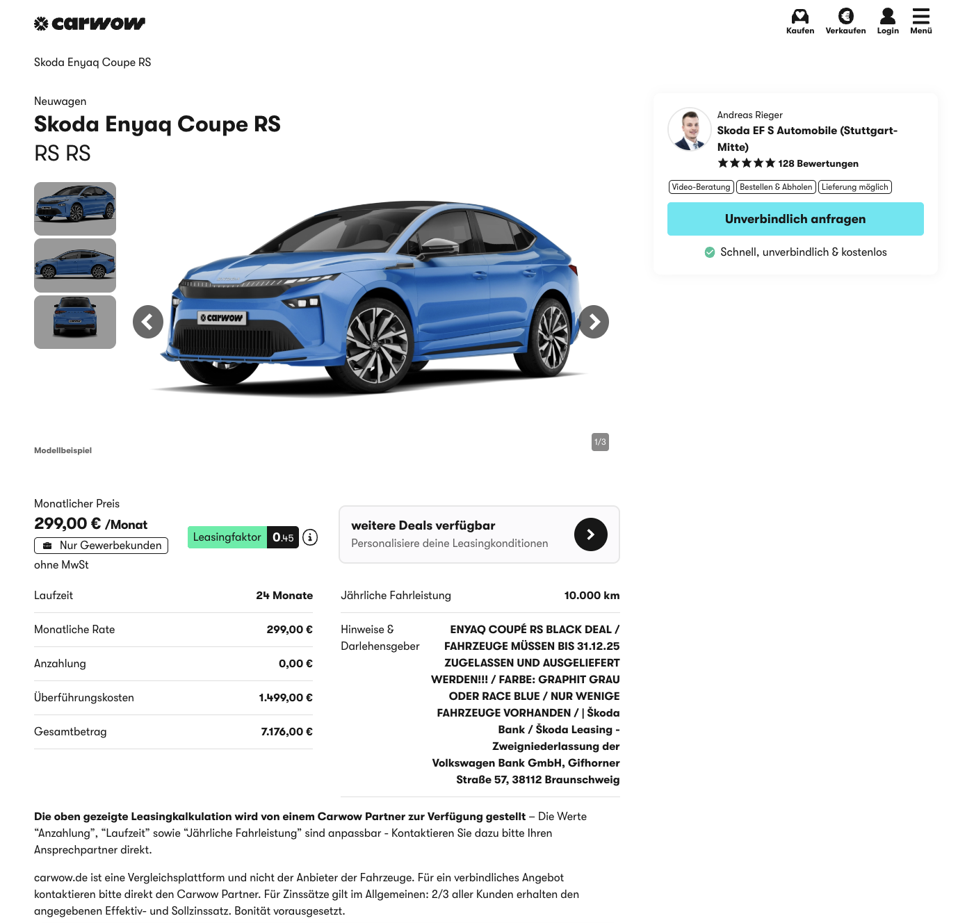 🔥 Škoda Enyaq RS im Leasing als Lagerwagen für 299 Euro im Monat netto