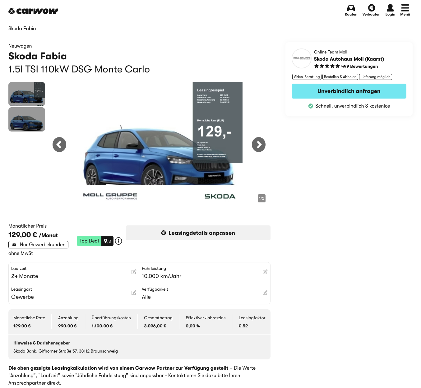 Kompakt in der Größe, aber erstaunlich erwachsen im Auftritt, der Škoda Fabia in der Ausstattungslinie Monte Carlo zeigt, wie attraktiv ein Kleinwagen im Geschäftsalltag sein kann. Den Škoda Fabia 1.5 TSI 110kW DSG Monte Carlo gibt es aktuell bei carwow für 129 Euro netto pro Monat, ein Angebot, das vor allem wegen der Kombination aus Top-Motorisierung, Automatik und sportlicher Ausstattung interessant bleibt. Eingerechnet ist eine Anzahlung von 990 Euro, und wer diese Summe auf die Laufzeit verteilt, kommt auf eine normalisierte Leasingrate von 170,25 Euro netto. Erhältlich ist der Fabia in Black Magic Perleffekt, was mit den dunklen Monte Carlo Details optisch sehr stimmig wirkt.