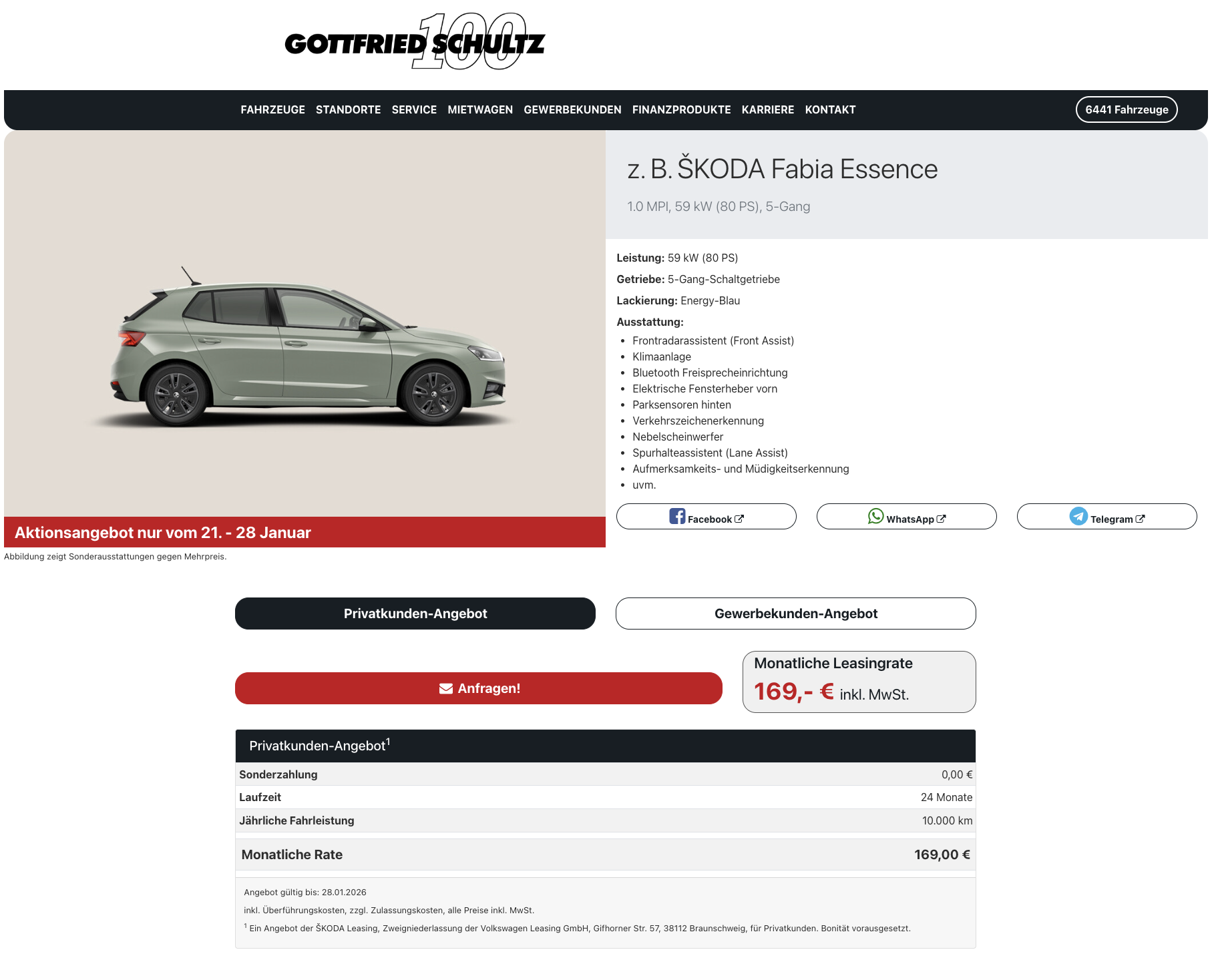 Kleinwagen, der nicht klein denkt, der Škoda Fabia 1.0 MPI 59 kW Essence bei Gottfried Schultz für 169 Euro brutto im Monat ist ein Angebot, das vor allem durch seine einfache Logik überzeugt. Die Überführungskosten sind für Privatkunden bereits enthalten, dadurch bleibt der Monatsbetrag übersichtlich und es kommt kein Extra Posten am Ende dazu. Gleichzeitig läuft das Ganze als Bestellaktion, der Fabia wird also nach Wunsch zusammengestellt, statt irgendein vorkonfiguriertes Lagerfahrzeug zu nehmen. Für die Planung wichtig ist die Lieferzeit von rund vier Monaten. Zeitlich ist das Angebot klar begrenzt, denn das Škoda Sonderleasing gilt vom 21.01 bis 28.01.2026, wer den Deal nutzen will, sollte also in diesem Zeitraum anfragen und bestellen.