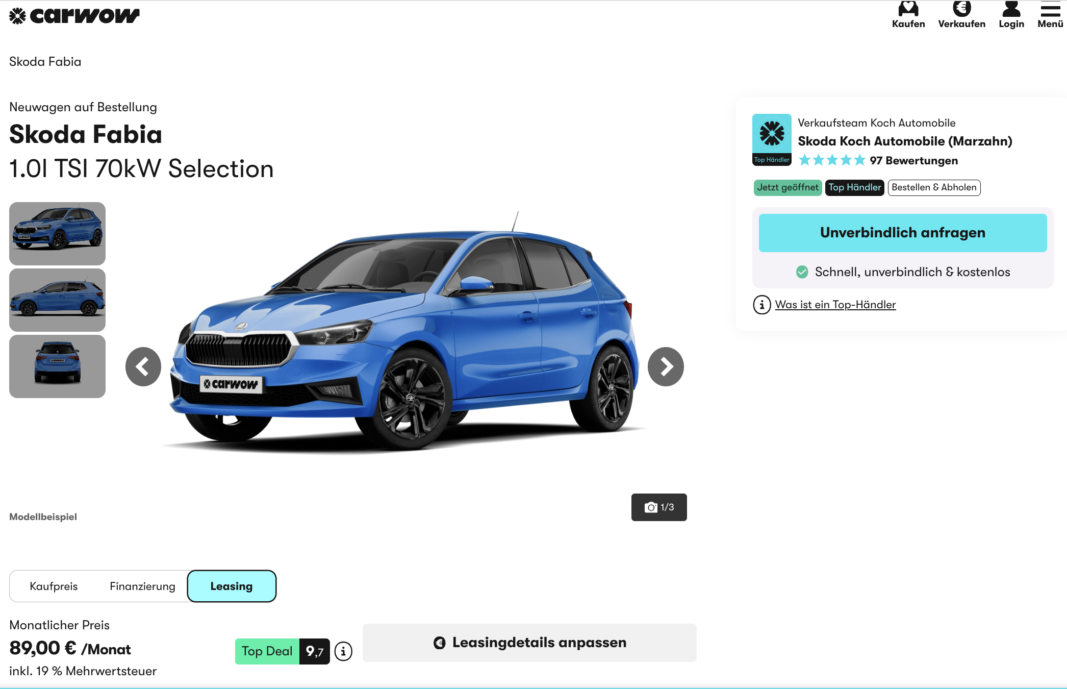 Škoda Fabia im Leasing als Bestellfahrzeug für 89 Euro im Monat brutto