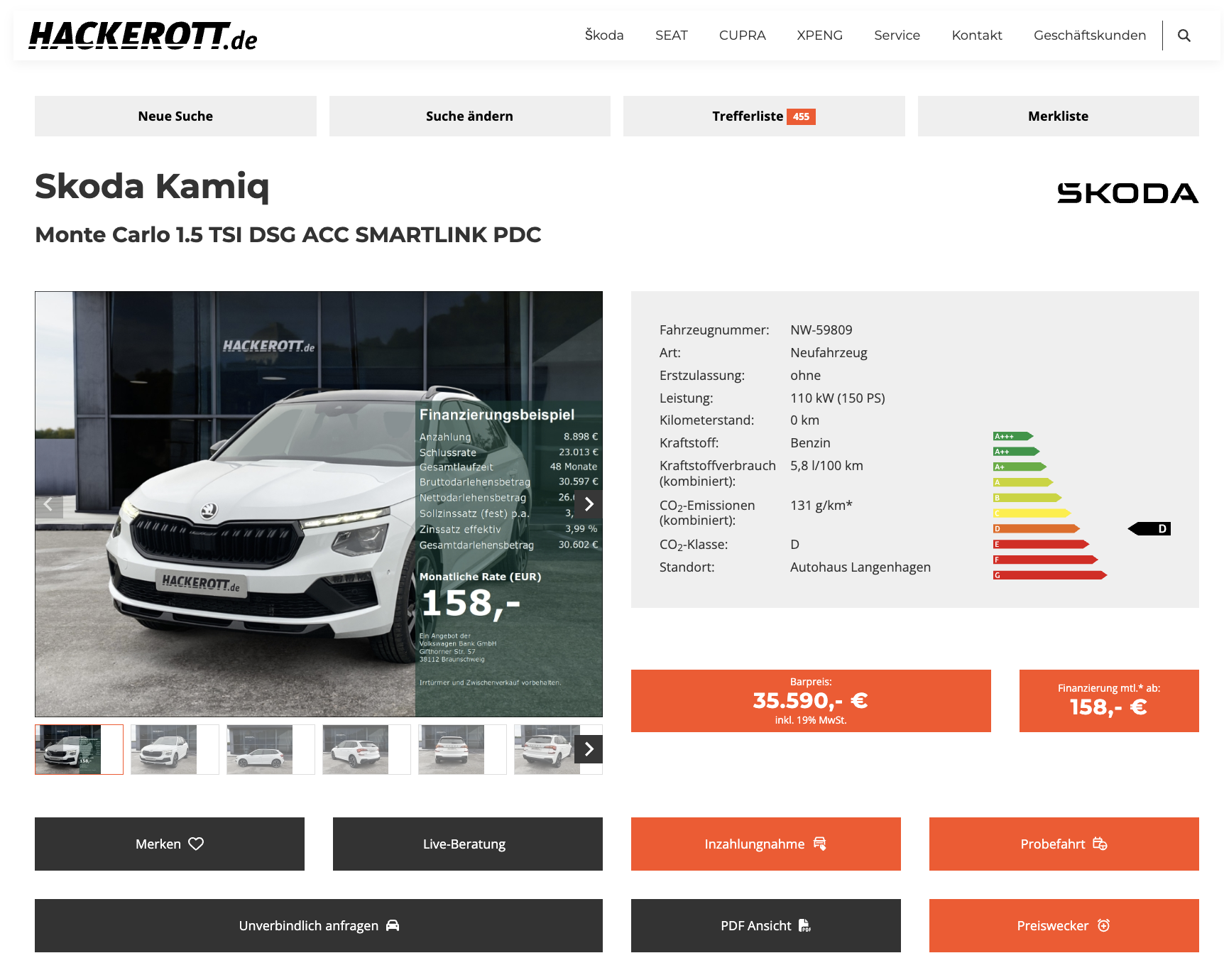Ein kompaktes SUV für Stadt, Pendelstrecke und Wochenendausflug. Škoda Kamiq 1.5 TSI 110 kW DSG bei Hackerott für 158 Euro brutto im Monat finanzieren, mit 8.898 Euro Anzahlung, 48 Monaten Laufzeit, 23.013 Euro Schlussrate und 3,99 Prozent effektivem Jahreszins, sofort verfügbar in Weiß.