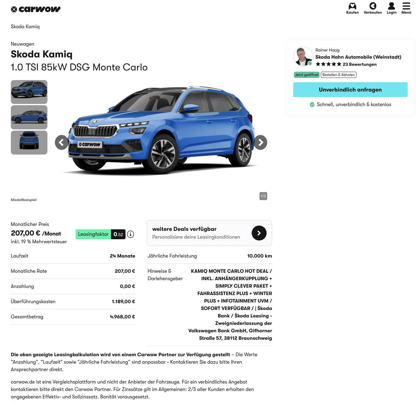 Das Angebot bei carwow ist auf 24 Monate Laufzeit und 10.000 Kilometer jährlich ausgelegt.