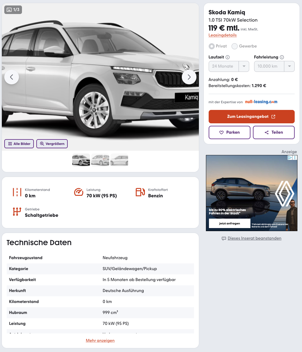 Der Škoda Kamiq zeigt, wie viel Auto in der kompakten Klasse möglich ist. Škoda Kamiq 1.0 TSI 70 kW Selection bei mobile.de für 119 Euro brutto im Monat, mit Leasingfaktor 0,39, als frei konfigurierbares Bestellfahrzeug. Die Lieferzeit liegt bei etwa fünf Monaten, dafür stellt ihr euch Lackfarbe, Felgen und Ausstattungspakete so zusammen, wie es zu eurem Alltag passt. Für ein City-SUV in dieser Klasse sind die Konditionen ungewöhnlich entspannt, hier geht es klar um clever kalkulierte Mobilität statt Prestige um jeden Preis.