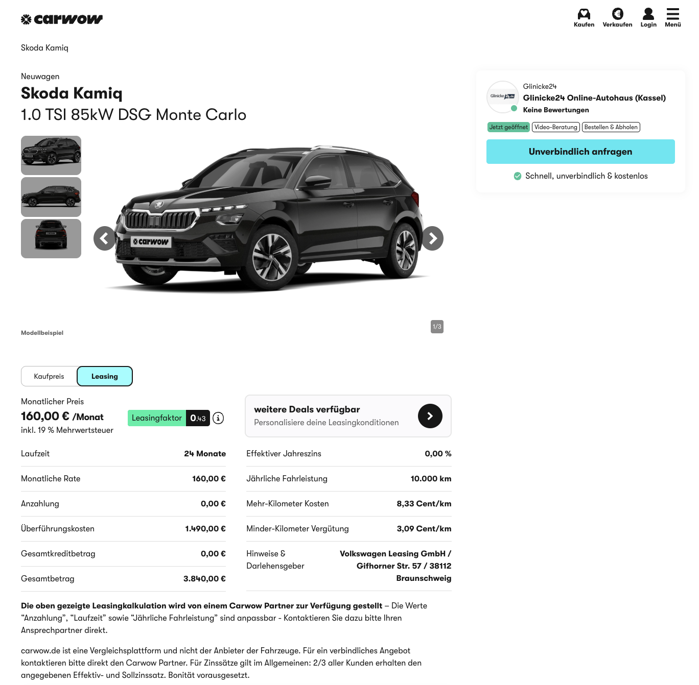 Das Angebote bei carwow ist auf 24 Monate Laufzeit und 10.000 Kilometer pro Jahr kalkuliert, Anpassungen sind möglich, falls ihr mehr Strecke plant. Im Vergleich dazu ruft der Platzhirsch für ein ähnliches Paket aktuell rund 340 Euro brutto im Monat auf. Hier stehen 160 Euro brutto inklusive Wartung und Inspektion in der Zeile.