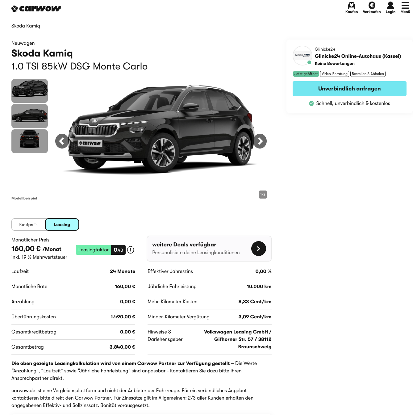 Das Angebot bei carwow ist auf 24 Monate Laufzeit und 10.000 Kilometer pro Jahr ausgelegt, Laufzeit und Fahrleistung lassen sich an eure Bedürfnisse anpassen. Besonders interessant wirkt das Paket durch das inklusive Service Paket für Wartung und Inspektion, was die laufenden Kosten gut kalkulierbar macht. Ein Blick auf den Markt zeigt den Vorteil deutlich, denn beim Platzhirsch werden für ein ähnliches Paket rund 317 Euro brutto im Monat aufgerufen. Der Kamiq Monte Carlo über carwow setzt sich damit preislich deutlich darunter, kombiniert sportliche Optik, umfangreiche Technik, echten Nutzwert und planbare Unterhaltskosten zu einem City SUV, das in dieser Klasse schwer zu übersehen ist.