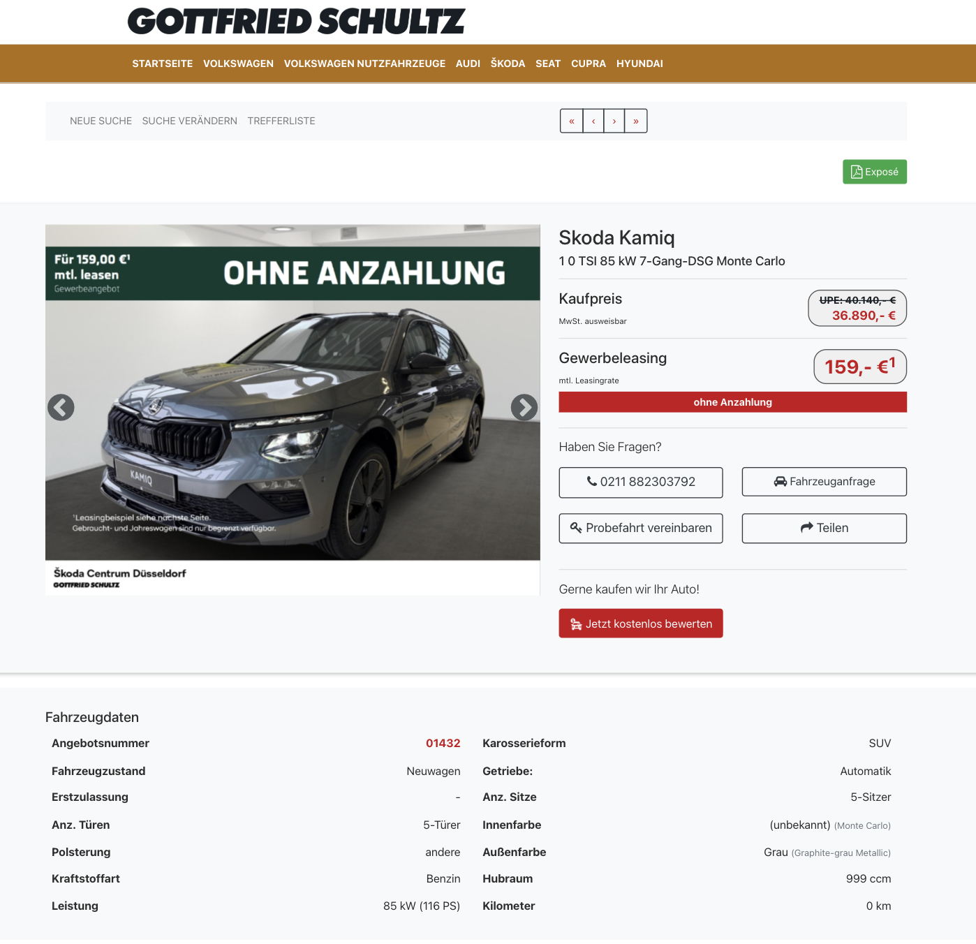 Das Angebot ist auf 24 Monate und 10.000 Kilometer pro Jahr ausgelegt. Im direkten Marktvergleich zeigt sich der Preisvorteil deutlich, denn vergleichbar ausgestattete Fahrzeuge liegen beim Platzhirsch bei rund 254 Euro netto pro Monat. Wer einen sportlich akzentuierten, sofort verfügbaren Kompakt-SUV mit Automatik sucht und Wert auf eine nachvollziehbare Kalkulation legt, findet im Škoda Kamiq Monte Carlo eine schlichte, aber überzeugende Lösung.