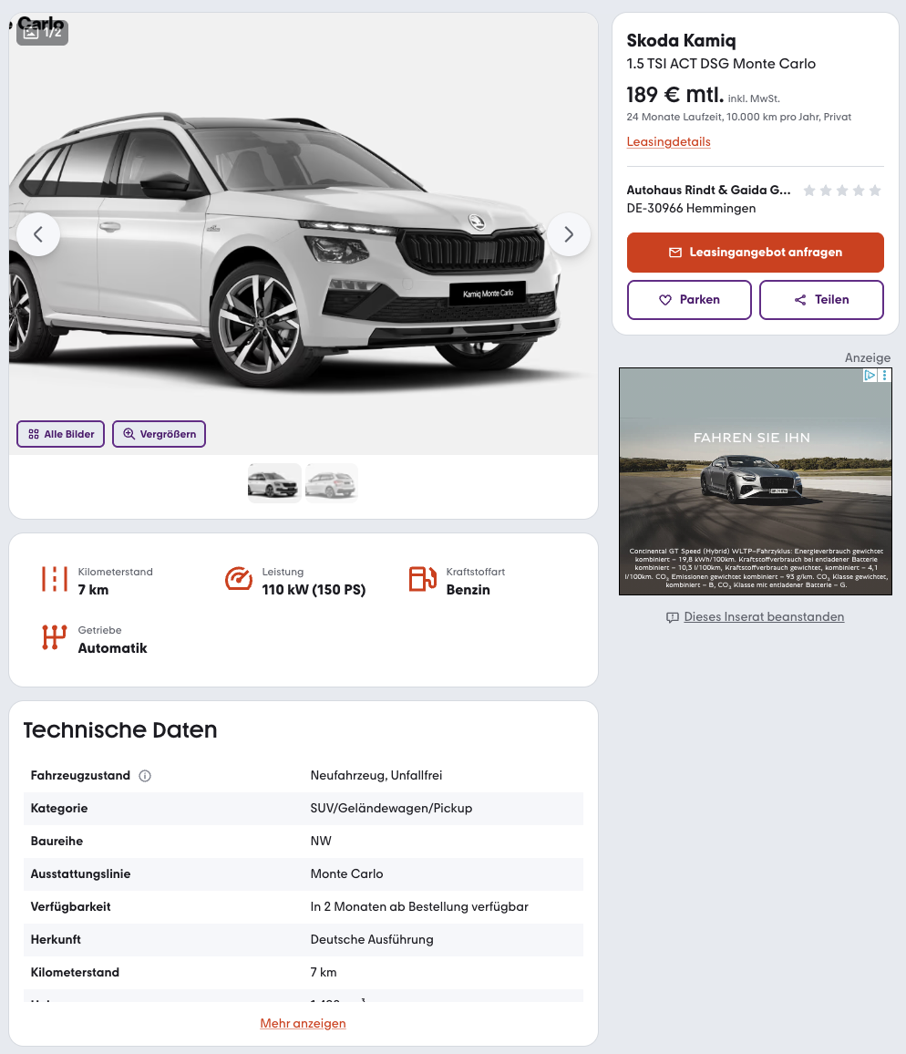 Das Leasing ist auf 24 Monate Laufzeit und 10.000 Kilometer pro Jahr ausgelegt. Im Vergleich wirkt das Angebot besonders attraktiv, denn für einen Škoda Kamiq werden beim Platzhirsch laut Angabe rund 375 Euro brutto im Monat aufgerufen. Mit 189 Euro brutto liegt dieses Angebot deutlich darunter und bietet damit eine sehr ausgewogene Mischung aus Leistung, Ausstattung und Preis.