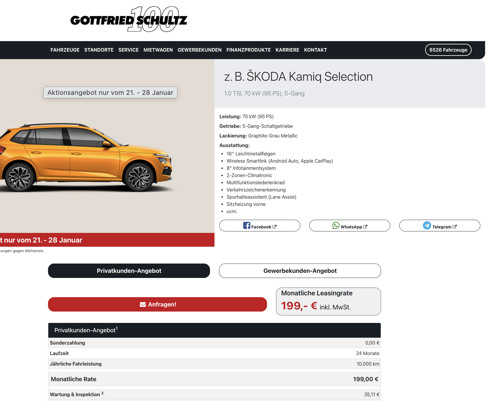 Wer aktuell keine Lust auf Elektro ⚡️ hat und lieber klassisch tankt ⛽️, bekommt mit diesem Deal eine sehr solide Alternative. Škoda Kamiq 1.0 TSI 70 kW Selection bei Gottfried Schultz für 199 Euro brutto im Monat inklusive Überführungskosten ist eine Leasingaktion, die vor allem durch ihre klare Kalkulation überzeugt. Das Angebot läuft über 24 Monate und ist mit 10.000 Kilometern pro Jahr gerechnet, damit bleibt der Vertrag überschaubar und gut planbar. Wichtig ist der Zeitraum, denn das Aktionsangebot gilt nur vom 21. bis 28. Januar. Wer sich den Preis sichern will, sollte also in diesem Fenster zuschlagen.