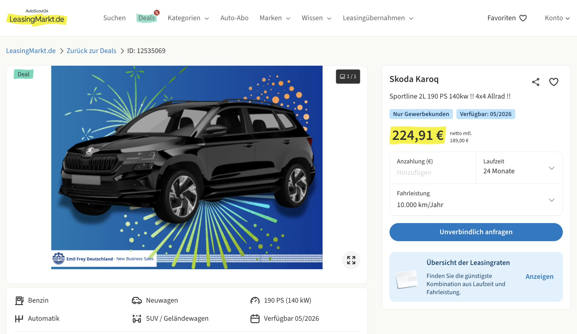 Aktuell führt Leasingmarkt den Škoda Karoq Sportlinemit Allradantrieb für monatlich 189 Euro netto für Geschäftskunden – ein günstiger Leasingfaktor von 0,48 ist die Folge! Wer auf der Suche nach einem kompakten SUV ist, das eine sportliche Optik mit einer ehrlichen und funktionellen Ausstattung verbindet, findet hier ein Paket, das nicht nur in der preislichen Bilanz, sondern auch im täglichen Einsatz überzeugt.