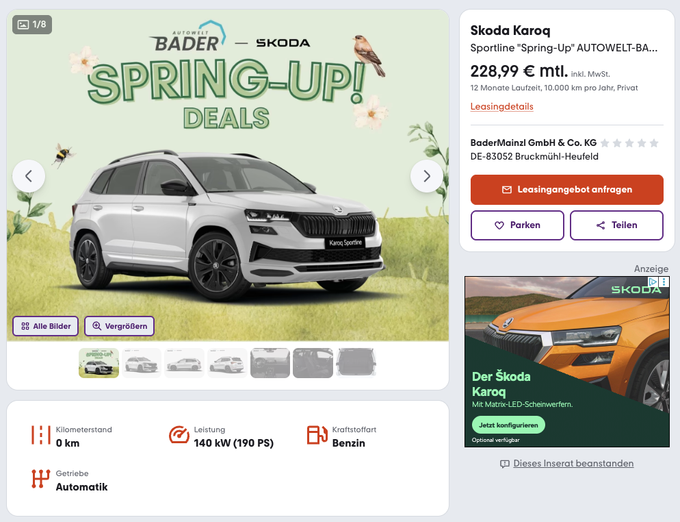 Gerade im direkten Marktvergleich wirkt das Angebot stark, denn während hier 228,99 Euro brutto pro Monat aufgerufen werden, liegen andere Anbieter für ein vergleichbares Modell teils bei rund 890 Euro brutto monatlich. Genau das macht diesen Karoq zu einem Deal, der nicht laut werden muss, um interessant zu sein.
