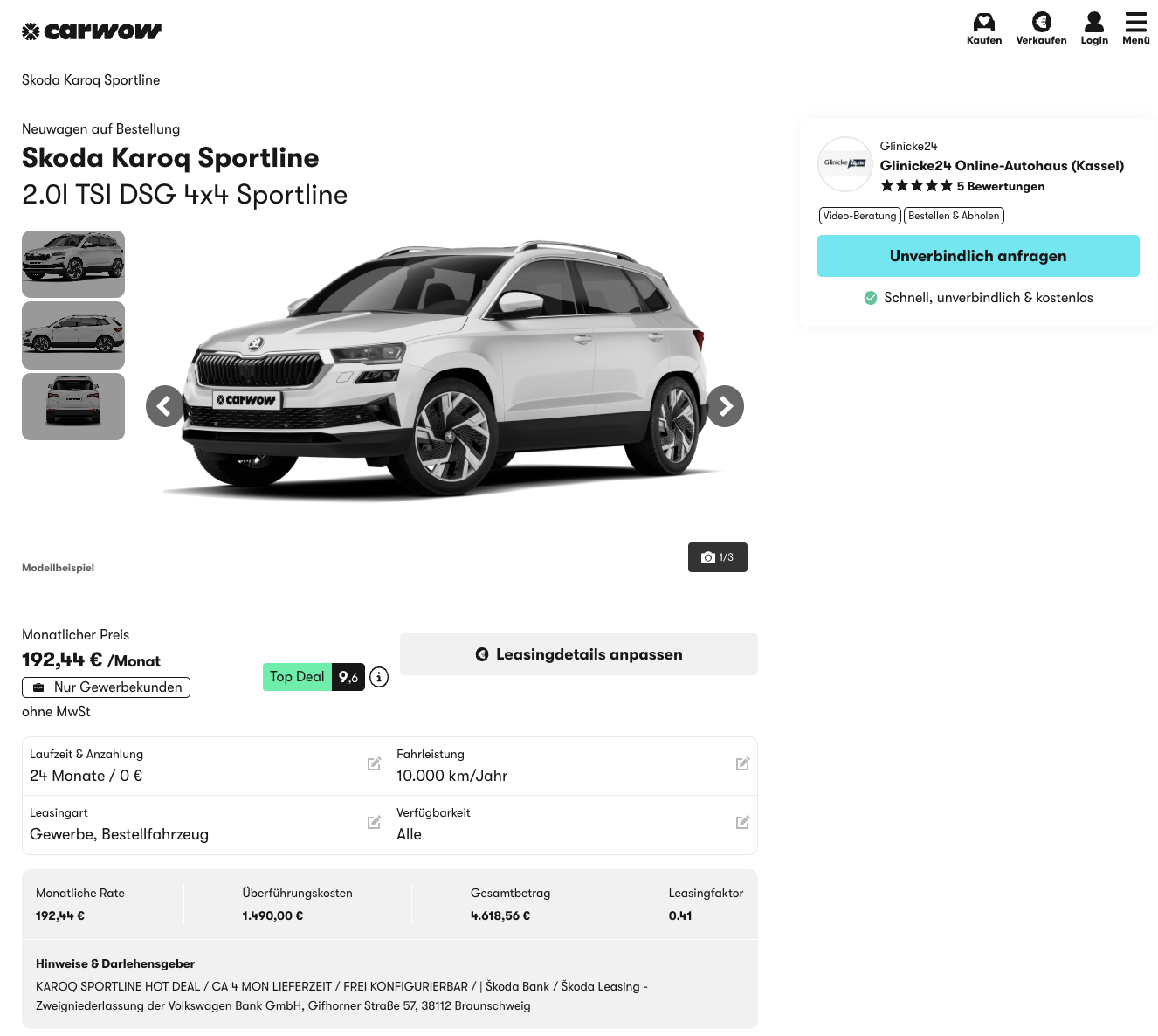 Škoda Karoq im Leasing als Bestellfahrzeug für 192 Euro im Monat netto