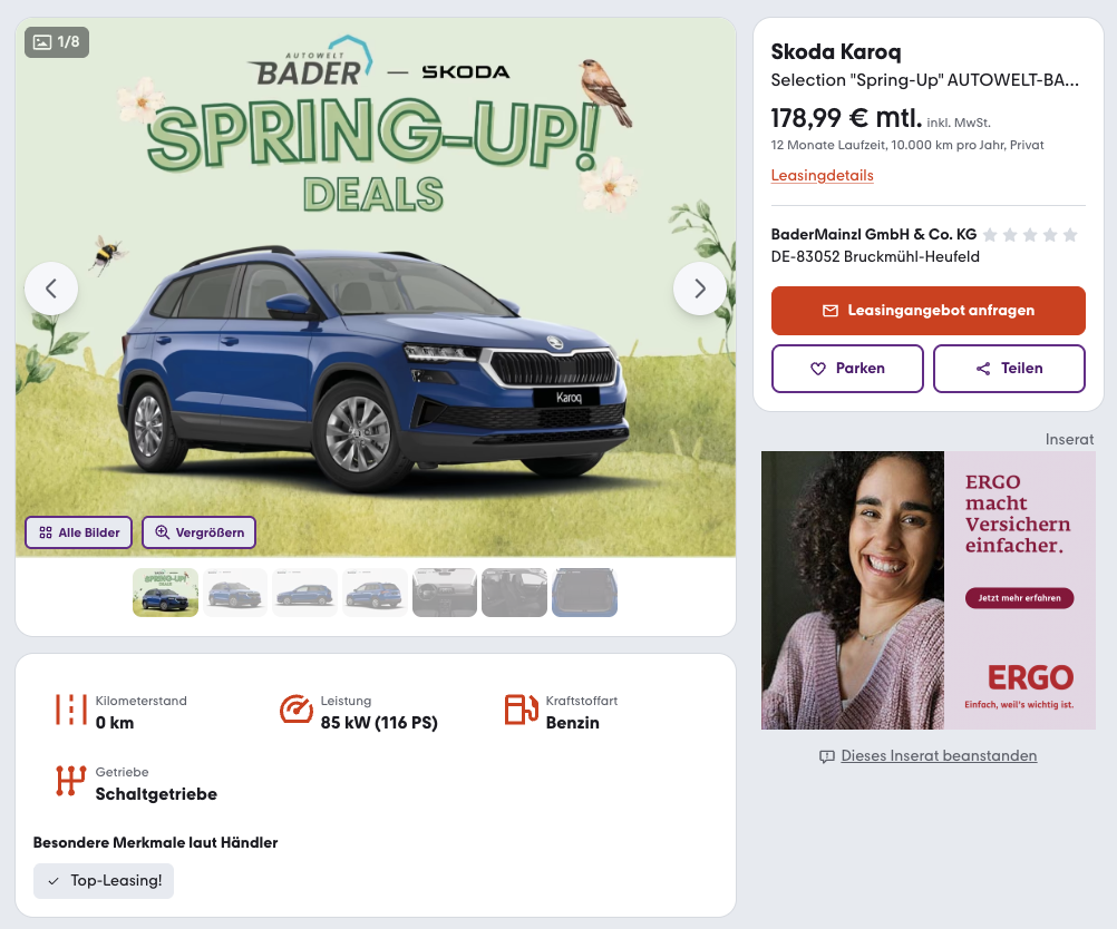 Seinen größten Auftritt hat dieses Angebot beim Vergleich. Während ein ähnlicher Škoda Karoq beim Marktführer derzeit bei rund 345 Euro brutto pro Monat liegt, steht dieses Angebot bei 178,99 Euro. Genau dadurch wird der Deal so interessant, denn hier bekommt ihr ein vollwertiges SUV mit kurzer Vertragslaufzeit zu einer Rate, die im besten Sinne aus dem Rahmen fällt.