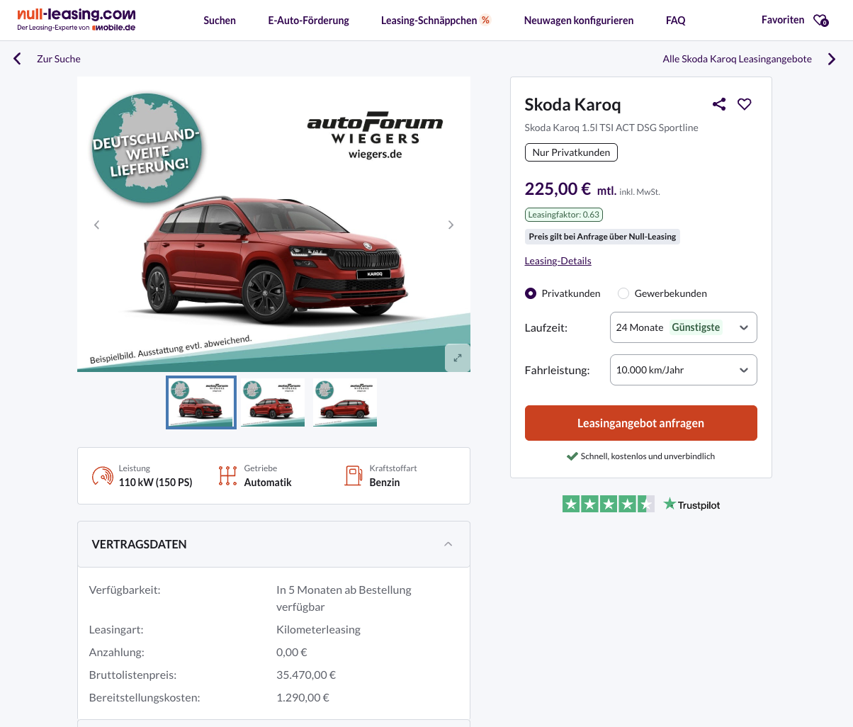 Im Marktvergleich wird der Abstand besonders deutlich, denn der Platzhirsch unter den Leasingportalen verlangt 392 Euro brutto für den Karoq.