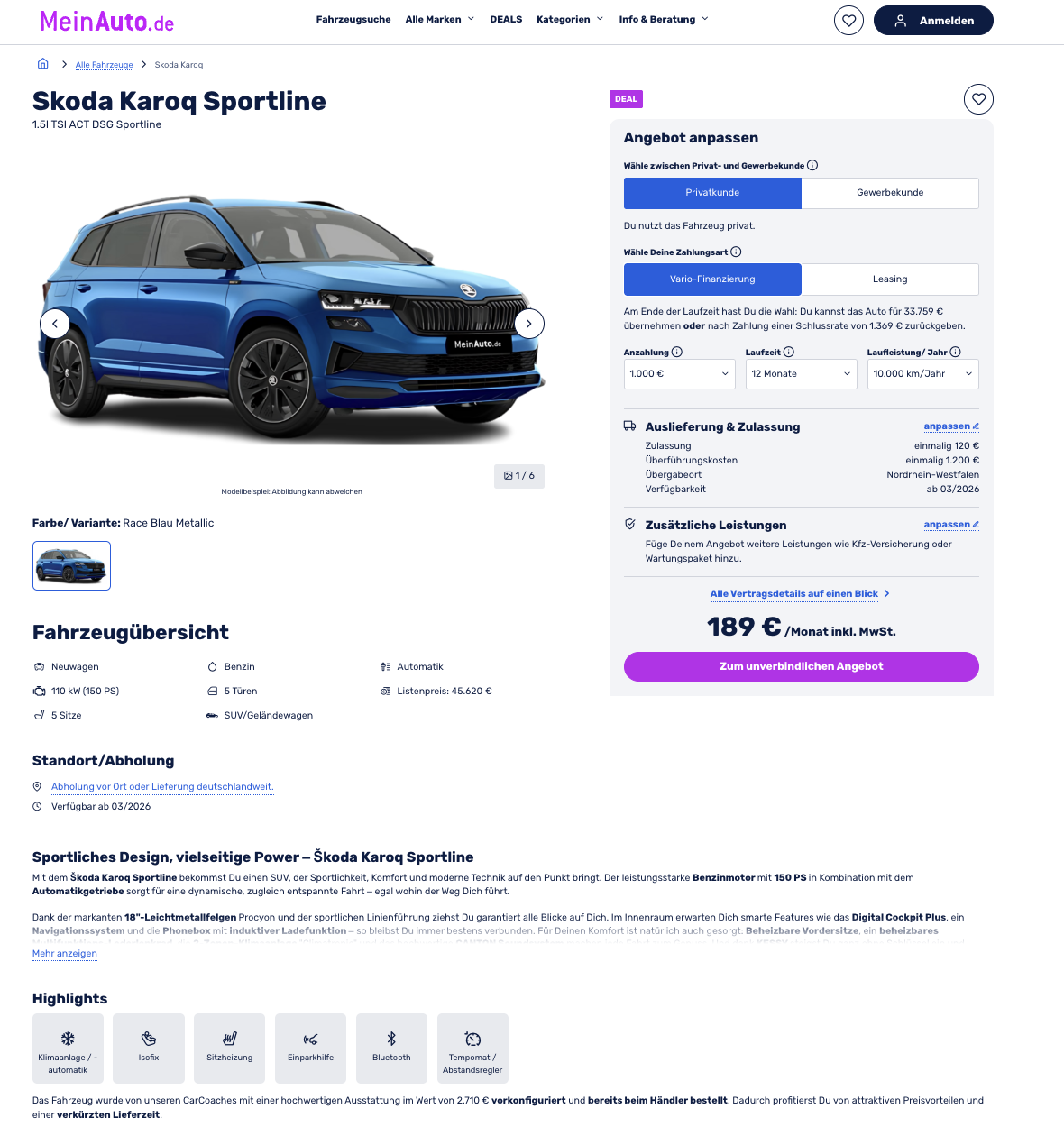 Kompaktes SUV mit sportlicher Note und niedriger Monatsrate, Škoda Karoq 1.5 TSI ACT DSG Sportline bei MeinAuto für 189 Euro im Monat brutto leasen. Das Angebot ist als Vario-Leasing kalkuliert, mit 1.000 Euro Anzahlung, 12 Monaten Laufzeit und 10.000 Kilometern pro Jahr. Der Karoq ist bereits bestellt und in Race Blau Metallic ab März 2026 verfügbar.