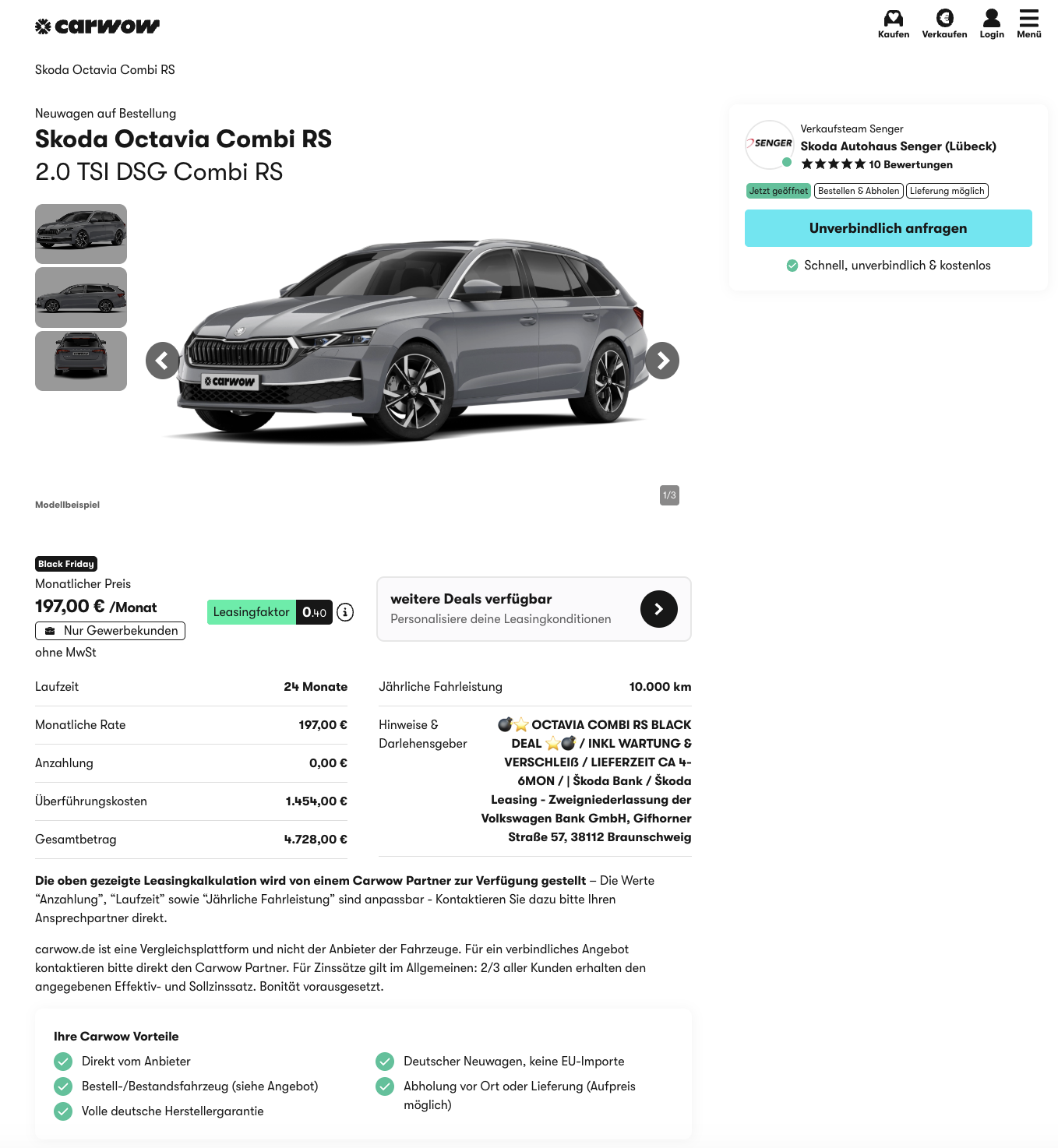 Die Leasingbasis liegt bei 24 Monaten und 10.000 Kilometern pro Jahr, eine Anpassung ist möglich, wenn mehr Laufleistung benötigt wird. Im Vergleich zeigt sich der Vorteil deutlich, denn beim bekannten Marktführer werden für ein ähnliches Angebot aktuell 403 Euro netto im Monat aufgerufen, hier sind es 197 Euro netto. Der Škoda Octavia Combi RS 2.0 TSI DSG wird damit im Black Friday Umfeld zu einem Full Service Angebot, das sportliche Qualitäten, viel Platz und einen klaren Rechenvorteil zusammenführt.