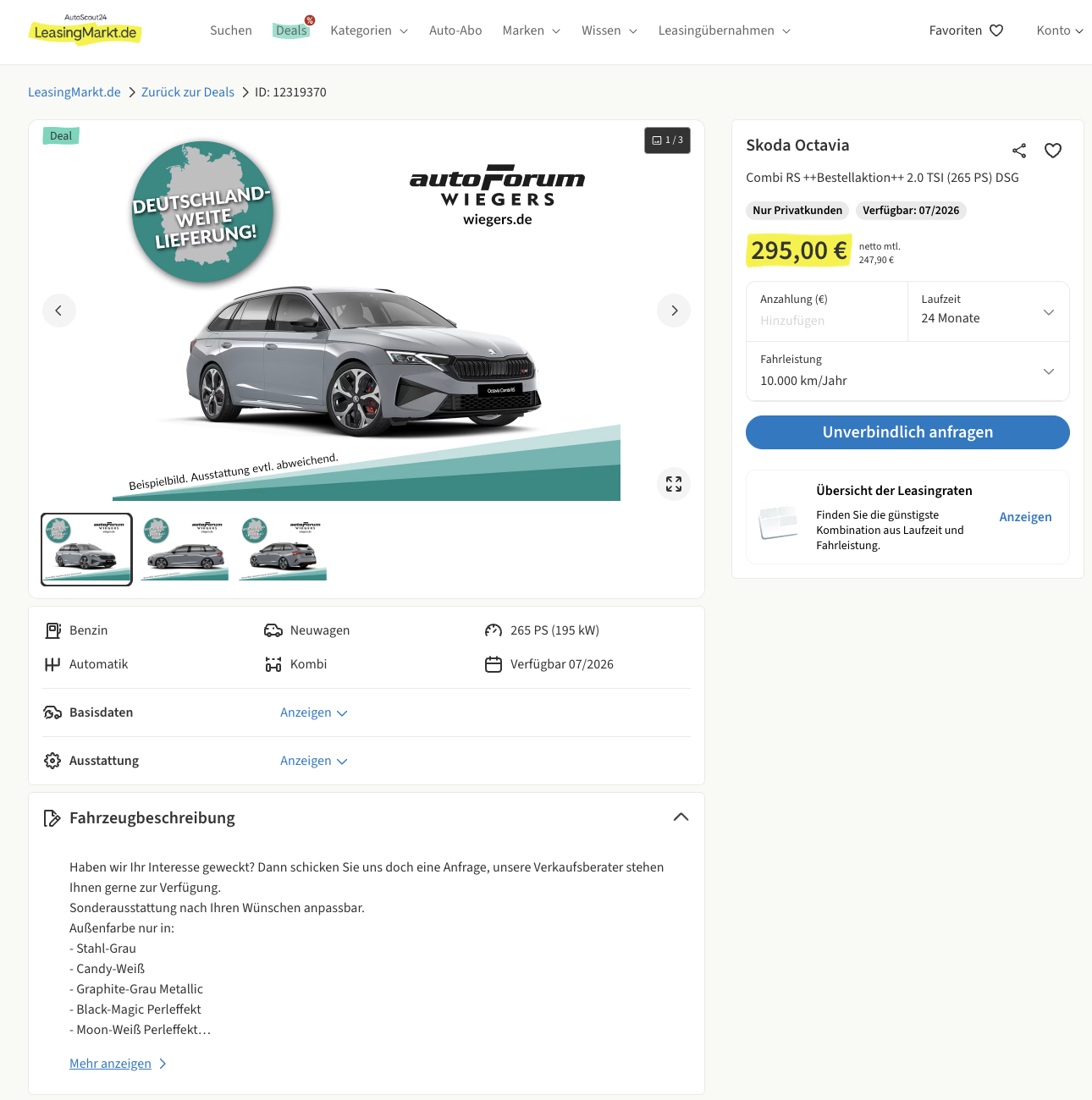 Der Škoda Octavia Combi RS kombiniert Platz und Komfort mit spürbarer Leistung. Bei LeasingMarkt können Privatkunden jetzt zuschlagen und den Škoda Octavia Combi 2.0 TSI DSG RS für 295 Euro im Monat brutto sichern, als frei konfigurierbares Bestellfahrzeug. Bei der Farbe bleibt ihr flexibel, zur Auswahl stehen Stahl Grau, Candy Weiß, Graphite Grau Metallic, Black Magic Perleffekt, Moon Weiß Perleffekt und Smokey Diamond Silber Metallic. Die Auslieferung ist ab Juli 2026 vorgesehen, damit eignet sich das Angebot für alle, die frühzeitig planen und trotzdem beim Preis schon jetzt zuschlagen wollen.