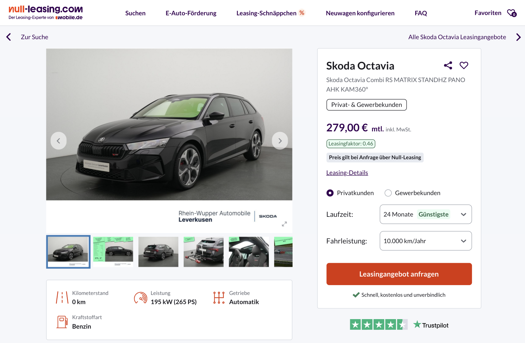 Ein Kombi, der Alltag und Sport verbindet. Škoda Octavia Combi RS 2.0 TSI DSG bei Null-Leasing für 279 Euro brutto im Monat im Privatleasing oder 199 Euro netto für Geschäftskunden. Der Wagen ist sofort verfügbar und steht in Black-Magic Perleffekt bereit. Gerade in dieser Leistungsklasse fällt die Rate positiv auf.