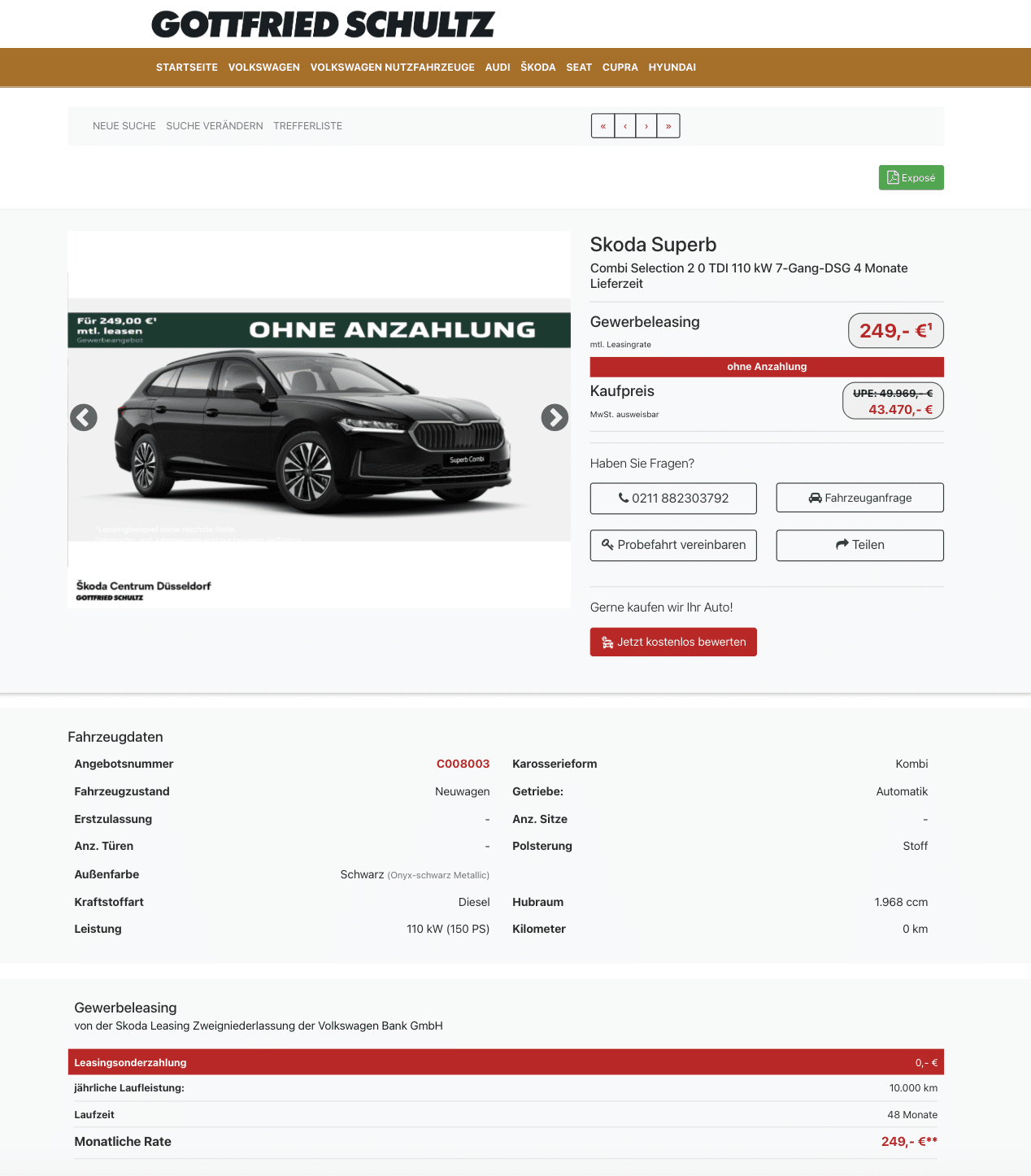 Das Angebot bei Gottfried Schultz läuft über 48 Monate und 10.000 Kilometer im Jahr. Mit 249 Euro netto im Monat liegt der Superb weit unter dem, was der Marktführer verlangt, dort werden rund 386 Euro fällig. Ein Preisvorteil, der sich Monat für Monat bemerkbar macht.