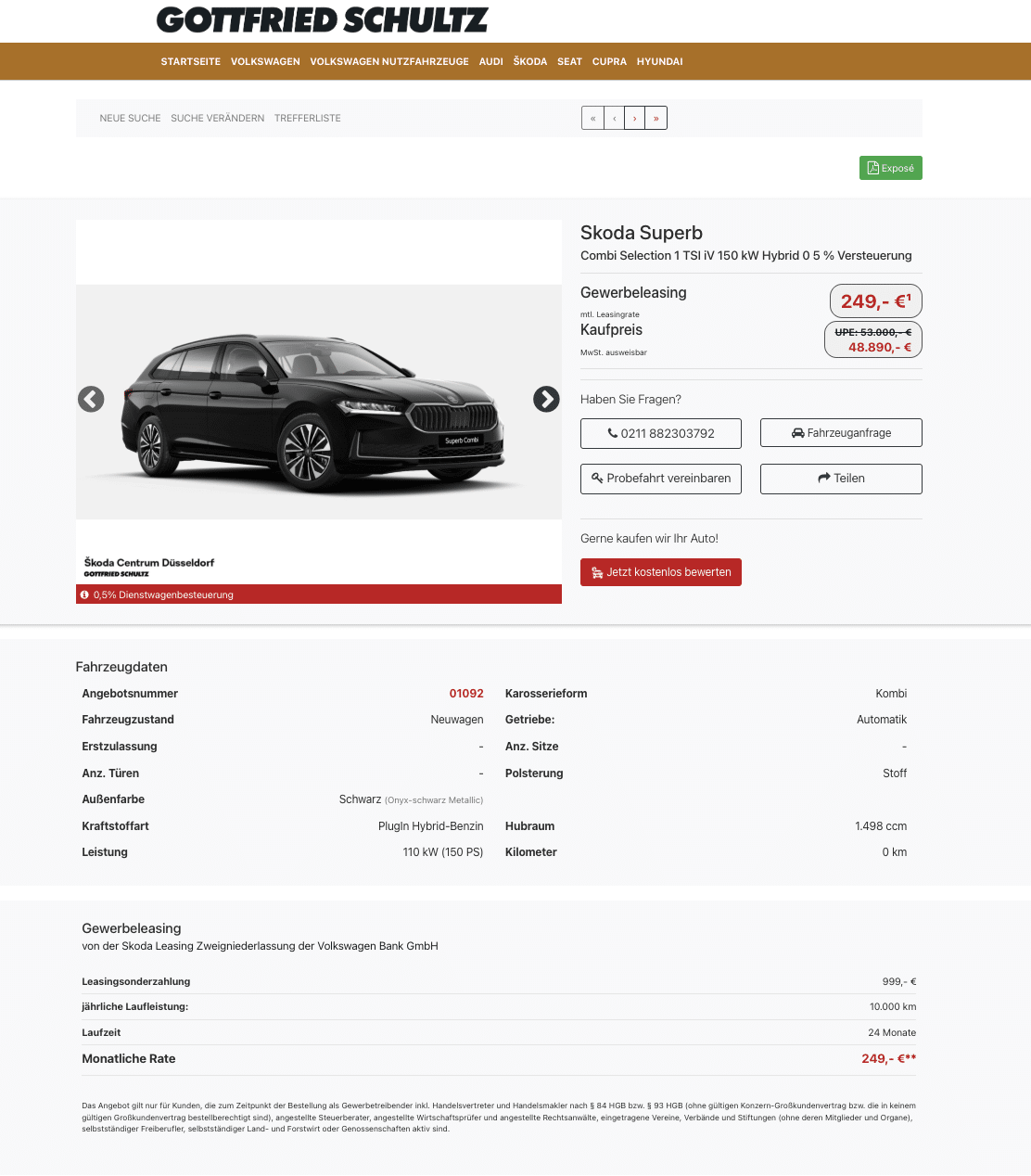 Ein Business-Kombi mit Plug-in-Hybridsystem. Bei Gottfried Schultz gibt es den Škoda Superb Combi 1 5 TSI iV Selection schon ab 249 Euro netto im Monat, bei einer Anzahlung von 999 Euro. Frei konfigurierbar, mit Lieferzeit nach Wunsch und der Möglichkeit, Lackierung, Felgen und Ausstattung individuell zu gestalten. Ein Angebot, das Stil, Raum und Nachhaltigkeit perfekt verbindet, aber nur für kurze Zeit, denn die Stückzahl ist begrenzt.