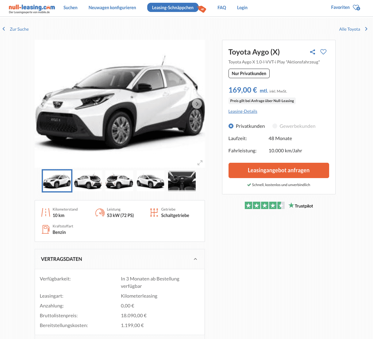 Die Konditionen bleiben klar: 48 Monate, 10.000 km/Jahr, 169 € brutto, Laufzeit und Kilometer lassen sich bei Bedarf anpassen. Ein weiterer Pluspunkt: Beim Platzhirsch ist der Toyota Aygo X aktuell nicht bestellbar. Über Null-Leasing bekommst du trotzdem eine planbare Lieferzeit und ein ehrlich kalkuliertes Angebot.