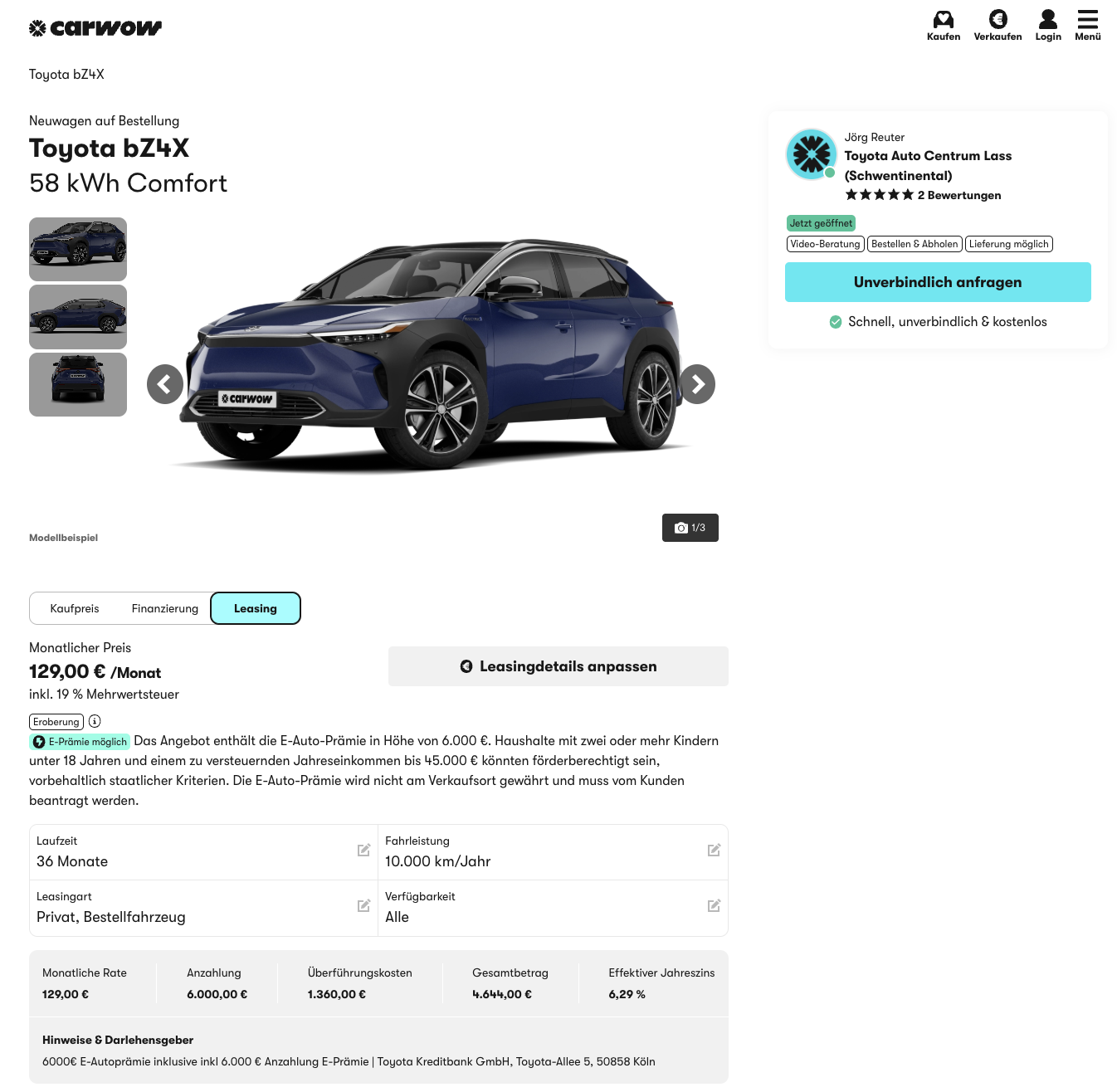Das carwow Angebot ist auf 36 Monate und 10.000 Kilometer pro Jahr gerechnet, Anpassungen sind in der Regel möglich. Entscheidend ist der Preisabstand, denn 129 Euro brutto pro Monat liegt deutlich unter vielen vergleichbaren Raten am Markt, dort werden für den bZ4X teils um die 333 Euro brutto monatlich aufgerufen.