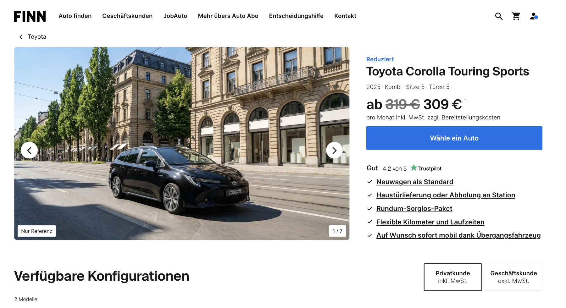 Der Toyota Corolla Touring Sports 1.8 Hybrid Teamplayer bei FINN für 309 Euro brutto im Monat ist ein Angebot für alle, die einen zuverlässigen Kombi mit überschaubaren Kosten suchen. Der Toyota Corolla Touring Sports kombiniert sparsamen Hybridantrieb mit viel Platz und einem Abo-Modell, das die Nutzung deutlich einfacher macht. Das Fahrzeug ist ab dem 19.03.2026 verfügbar und wird über ein All-inclusive Auto-Abo angeboten. (FINN)