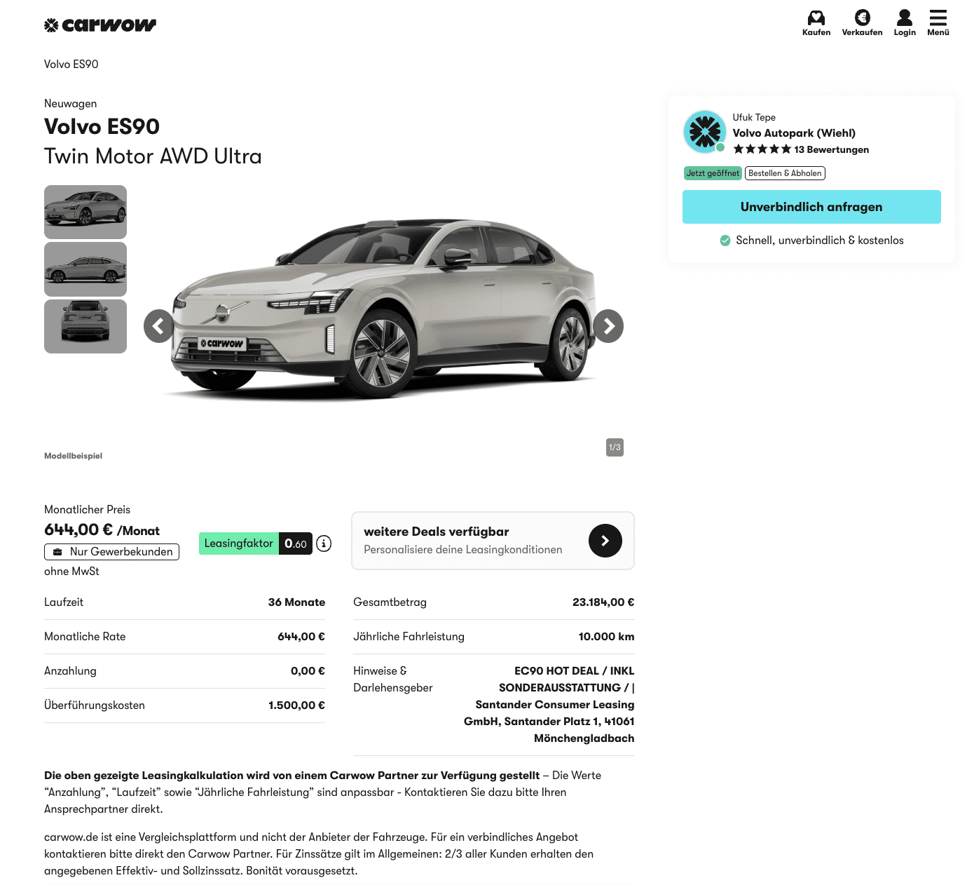 Bei carwow steht die vollelektrische Limousine Volvo ES90 Twin Motor AWD in der Ausstattung Ultra für 644 Euro netto pro Monat bereit. Die Konditionen sind auf 48 Monate und 10.000 Kilometer pro Jahr kalkuliert, das Fahrzeug ist bereits bestellt und kann kurzfristig übernommen werden. Wer eine leise, repräsentative E-Reiselimousine für Kundenbesuche und Langstrecken sucht, bekommt hier Premium-Komfort zum fairen Kurs. Ein vergleichbares Paket liegt beim Marktführer bei 875 Euro netto pro Monat, der Unterschied ist im Fuhrparkbudget sofort spürbar.