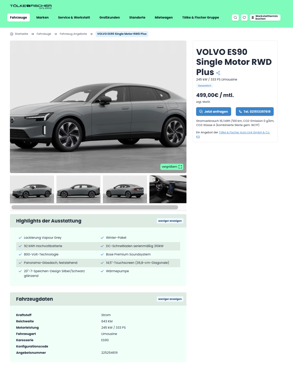 Die Beispielrechnung bei Tölke+Fischer basiert auf 36 Monaten Laufzeit und 10.000 Kilometern pro Jahr, beide Werte lassen sich an euer Profil anpassen, wenn mehr Strecke oder eine andere Dauer sinnvoll ist. Spannend wird der Blick auf den Marktvergleich. Ein ähnlich ausgestatteter ES90 beim Platzhirsch würde bei 733 Euro netto im Monat liegen. Die 499 Euro netto bei Tölke+Fischer bedeuten einen Abstand von 234 Euro pro Monat, über drei Jahre ergibt sich eine Differenz von 8.424 Euro, die im Fuhrparkbudget deutlich sichtbar bleibt.