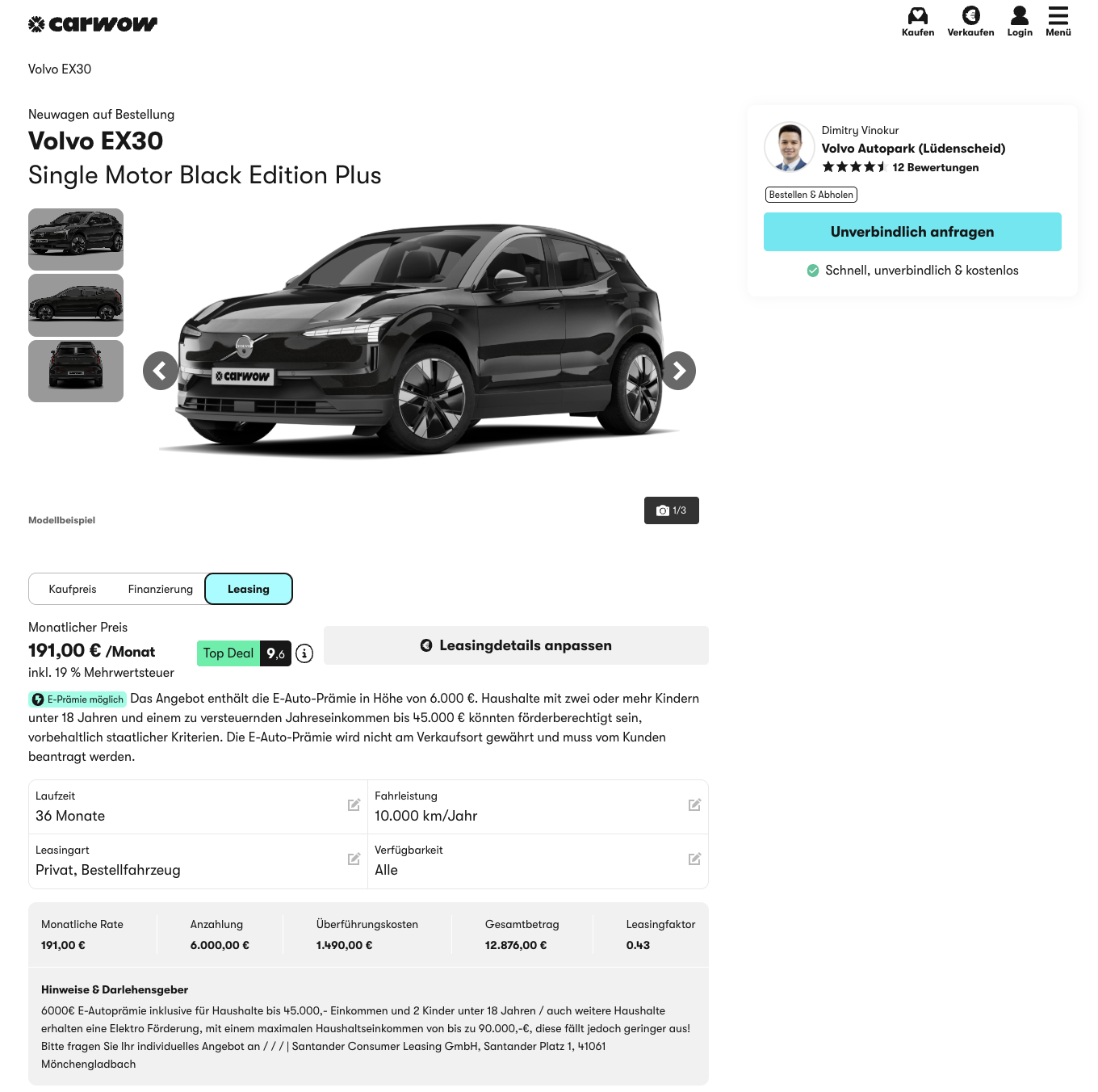Der EX30 ist das kompakte Elektro-SUV von Volvo, reduziert im Auftritt, modern im Innenraum und klar auf den Alltag zugeschnitten. Volvo EX30 Single Motor Black Edition Plus bei carwow für 191 Euro brutto im Monat ist im Privatleasing verfügbar und bietet als Bestellfahrzeug den Vorteil, dass sich Ausstattung und Optik frei konfigurieren lassen. Kalkuliert wird das Angebot mit einer Sonderzahlung von 6.000 Euro brutto, die als Umweltprämie angesetzt ist. So entsteht eine niedrige Monatsrate auf dem Papier, gleichzeitig lohnt sich ein transparenter Blick auf die echte Gesamtbelastung über die Laufzeit.
