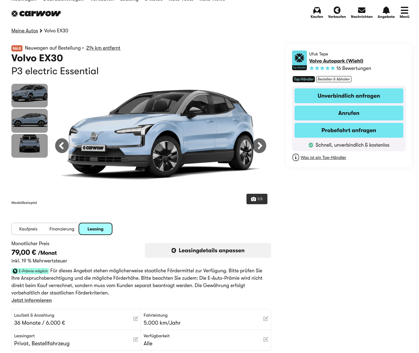 Der Volvo EX30 gehört zu den kompakten Elektro-SUV, die bewusst auf ein klares Konzept setzen. Volvo EX30 P3 Electric Essential bei carwow für 79 Euro brutto im Monat fällt dabei vor allem durch die niedrige Einstiegsrate auf. Diese ist allerdings an eine Sonderzahlung von 6.000 Euro gekoppelt, die als Umweltprämie angesetzt wird. Rechnet man diesen Betrag auf die Laufzeit um, ergibt sich eine normalisierte Rate von 246 Euro brutto im Monat. Wer das Fahrzeug ohne Sonderzahlung kalkulieren möchte, landet bei 262 Euro brutto monatlich. Das Angebot bezieht sich auf ein frei konfigurierbares Bestellfahrzeug mit rund fünf Monaten Lieferzeit.