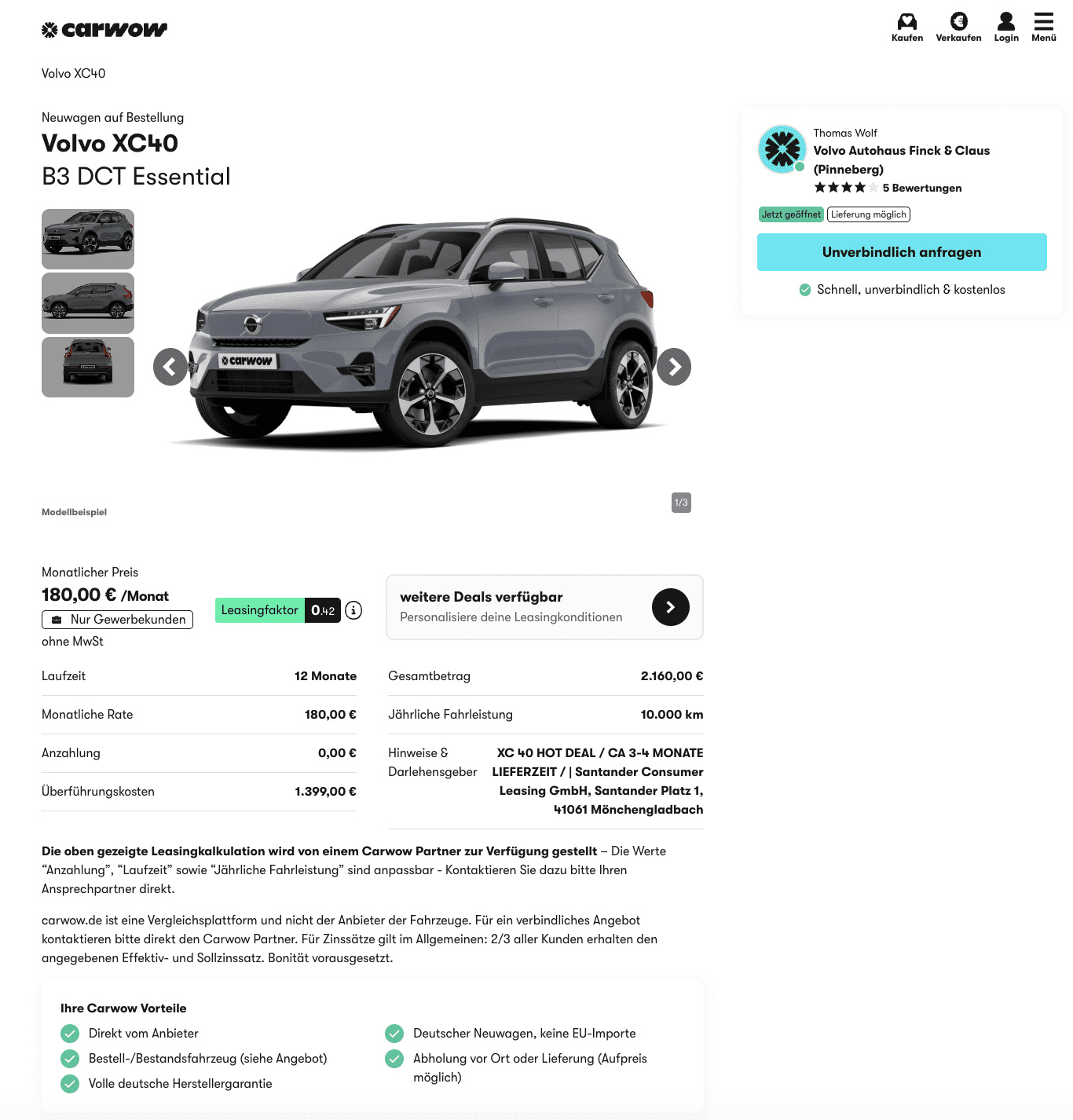 Urbaner Style trifft nordische Coolness! Der Volvo XC40 B3 Essential DCT ist kein SUV für Showeffekte, sondern einer für Menschen mit Stil, Haltung und einem Gespür für Qualität. Aktuell bekommt ihr das stylische Kompakt-SUV bei carwow für schlanke 180 Euro netto im Monat im Geschäftsleasing, ein Preis, der selbst Leasing-Profis staunen lässt. Während der Marktführer für denselben Wagen über 600 Euro verlangt, rollt ihr hier mit skandinavischer Gelassenheit zum Drittel des Preises vom Hof. Frei konfigurierbar, mit einer Lieferzeit von drei bis vier Monaten und 12 Monaten Laufzeit, ist dieses Angebot so flexibel wie euer Lifestyle.