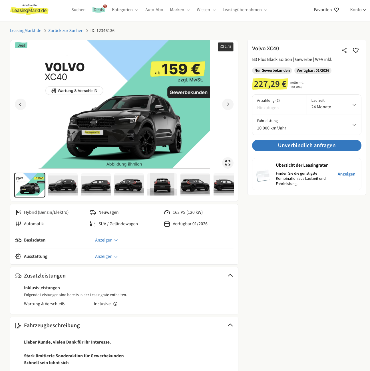 Kompaktes SUV mit Premium-Feeling leasen. Den Volvo XC40 B3 DCT Plus Black Edition gibt es bei LeasingMarkt aktuell für 191 Euro netto pro Monat, als Full-Service-Leasing für Geschäftskunden inklusive Wartung und Verschleiß. Verfügbar ab Januar 2026, Abholung und Rückgabe erfolgen in NRW, damit bleibt das Paket auch organisatorisch sauber planbar.