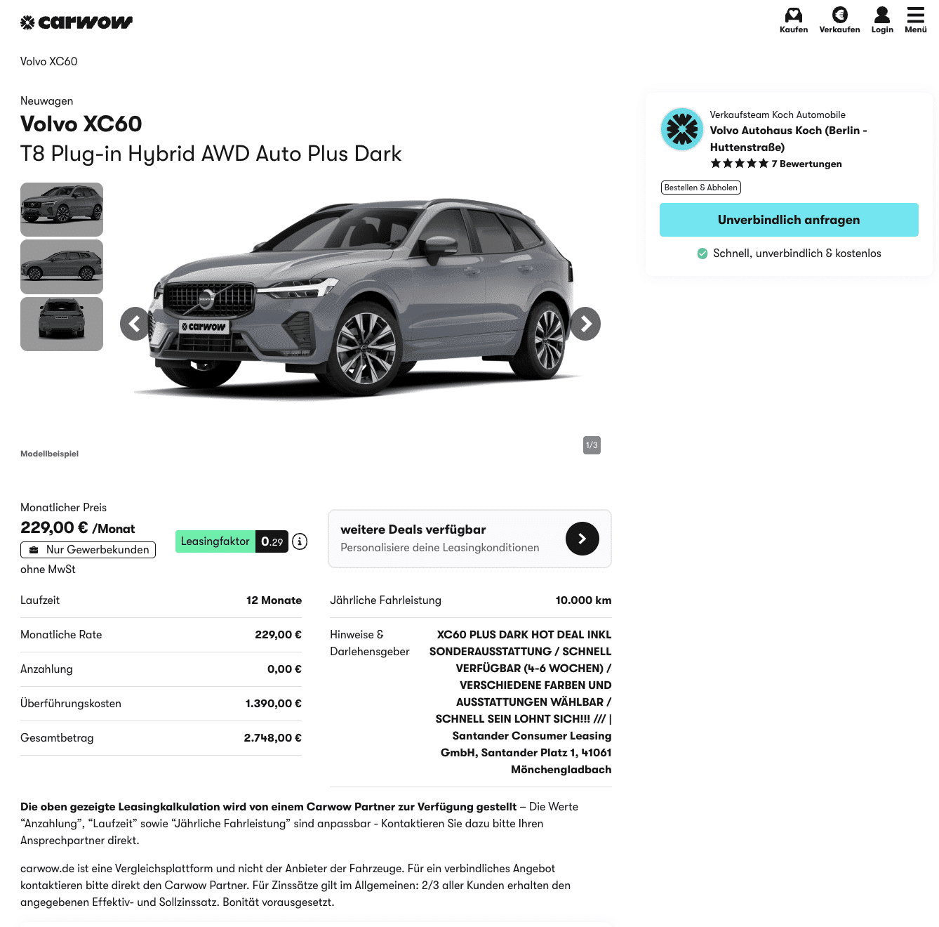 Ein Angebot mit Wow-Faktor! Bei carwow steht der Volvo XC60 als T8 Plug-in-Hybrid AWD in der Ausführung Plus Dark für 229 € netto pro Monat im 12-Monats-Leasing. Das Kontingent ist limitiert, die Lieferzeit liegt bei ca. 4–6 Wochen – Farben und Ausstattungsvarianten sind kurzfristig verfügbar. Wer ein Premium-SUV mit echter Elektro-Alltagstauglichkeit sucht, bekommt hier Luxus zum Flottenkurs.