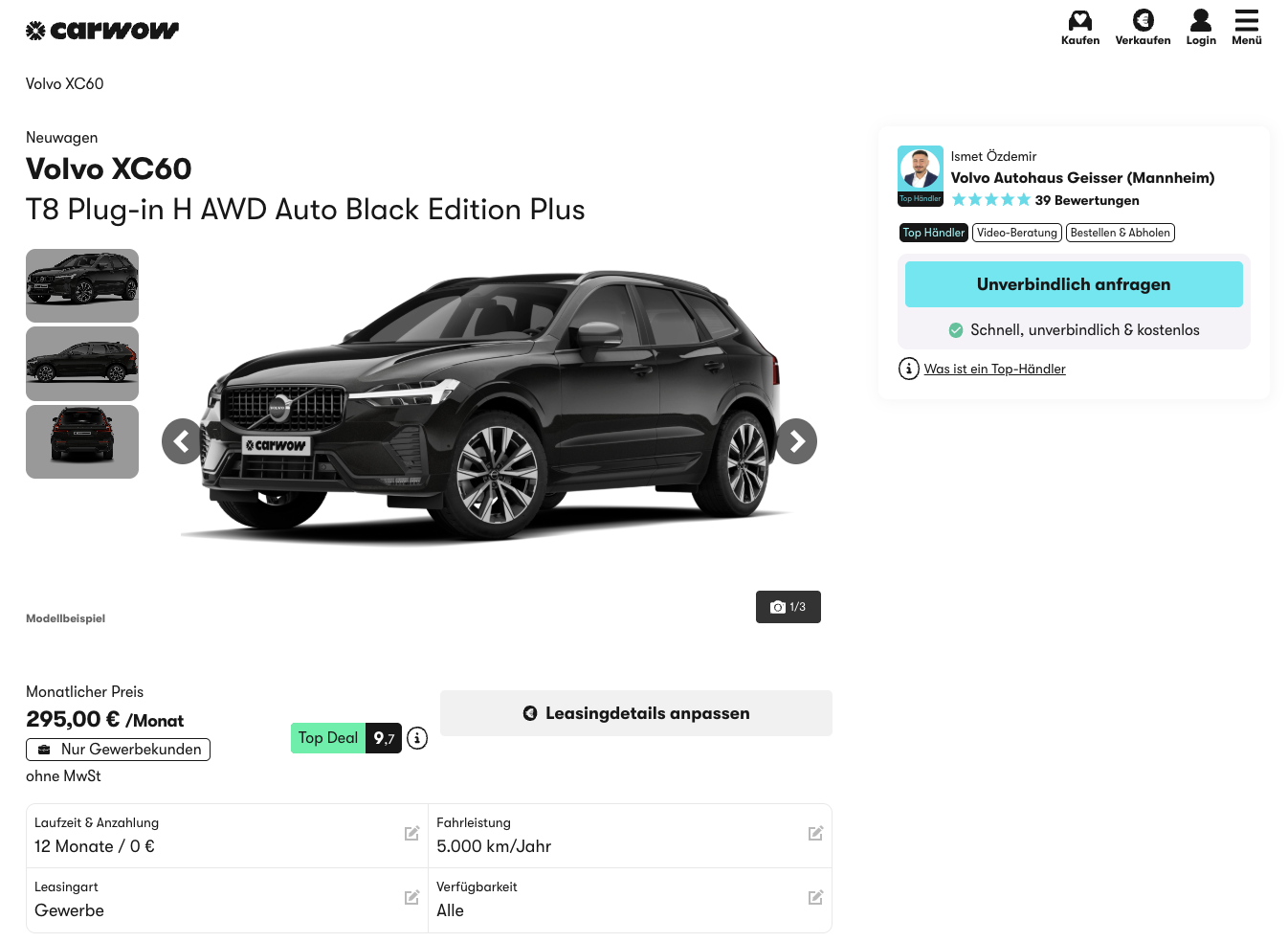 Ein Premium-SUV mit Plug-in-Hybridantrieb muss im Leasing nicht automatisch vierstellig werden. Der Volvo XC60 T8 Plug-in-Hybrid AWD Plus Black Edition bei carwow für 295 Euro netto im Monat zeigt genau das sehr deutlich. Das Angebot richtet sich an Geschäftskunden und basiert auf 12 Monaten Laufzeit sowie 5.000 Kilometern pro Jahr. Besonders praktisch, der XC60 ist sofort verfügbar und als Lagerwagen in verschiedenen Farben erhältlich. Gerade im aktuellen Markt ist das ein Punkt, der den Deal noch interessanter macht.