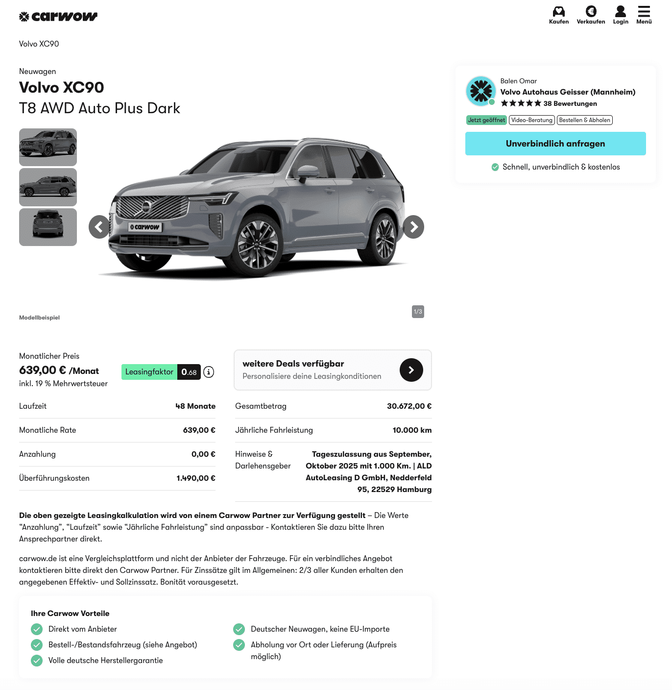 Das Angebot bei carwow wurde für 48 Monate Laufzeit und 10.000 Kilometer im Jahr kalkuliert. Anpassungen an Fahrleistung oder Dauer sind selbstverständlich möglich. Und der Preis spricht für sich: Während der Marktführer für den gleichen XC90 T8 Plus Dark aktuell rund 1.000 Euro brutto monatlich verlangt, bekommt ihr ihn hier für 639 Euro, ein Unterschied, der sich sehen lassen kann.