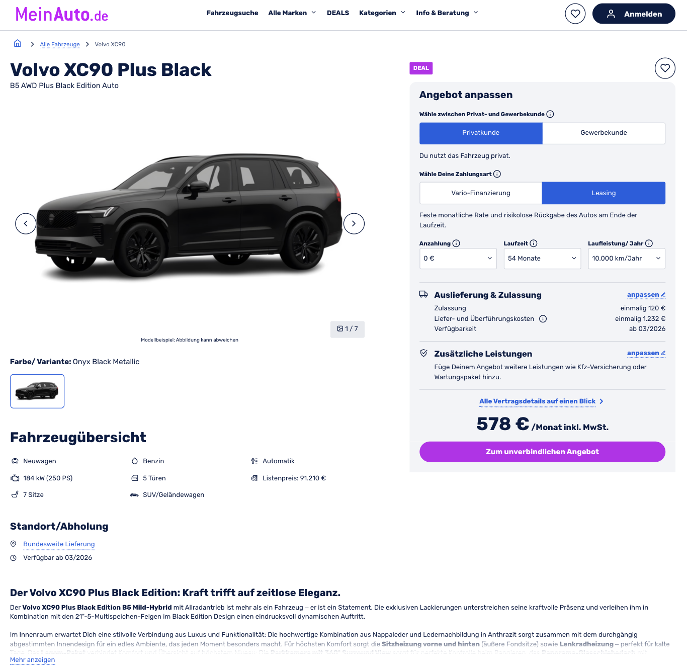 Kalkuliert ist das Angebot mit 54 Monaten Laufzeit und 10.000 Kilometern pro Jahr, beides kann angepasst werden. Die 578 Euro brutto sind im Vergleich interessant, weil ähnliche Angebote bei großen Anbietern häufig über 1.000 Euro monatlich liegen. Insgesamt entsteht ein sehr rundes Paket für alle, die einen komfortablen, großen Volvo mit guter Ausstattung suchen.