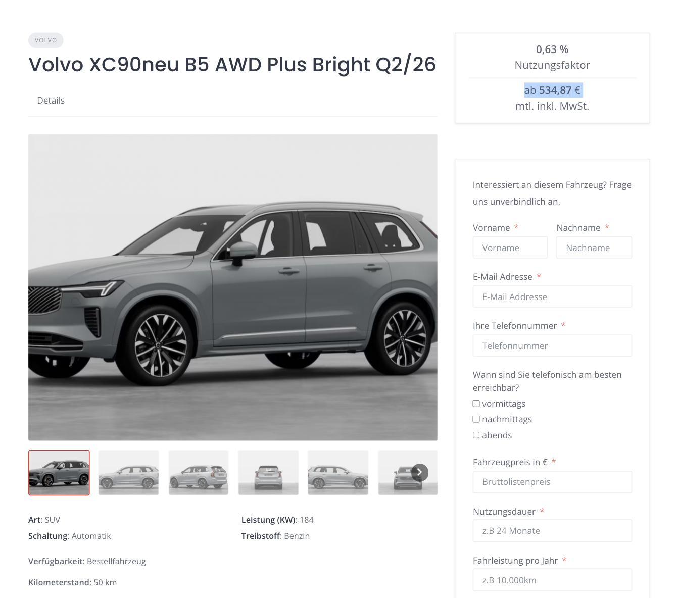 Die Kalkulation basiert auf 12 Monaten Laufzeit und 10.000 Kilometern pro Jahr, hinzu kommen 990 Euro brutto für Überführung und Zulassung. Gerade im Vergleich zu vielen anderen Angeboten wirkt dieser XC90 deshalb ungewöhnlich attraktiv. Hier geht es nicht nur um ein großes SUV, sondern um eine seltene Kombination aus kurzer Laufzeit, hoher Qualität und einer Rate, die in dieser Klasse fast schon irritierend niedrig ausfällt.