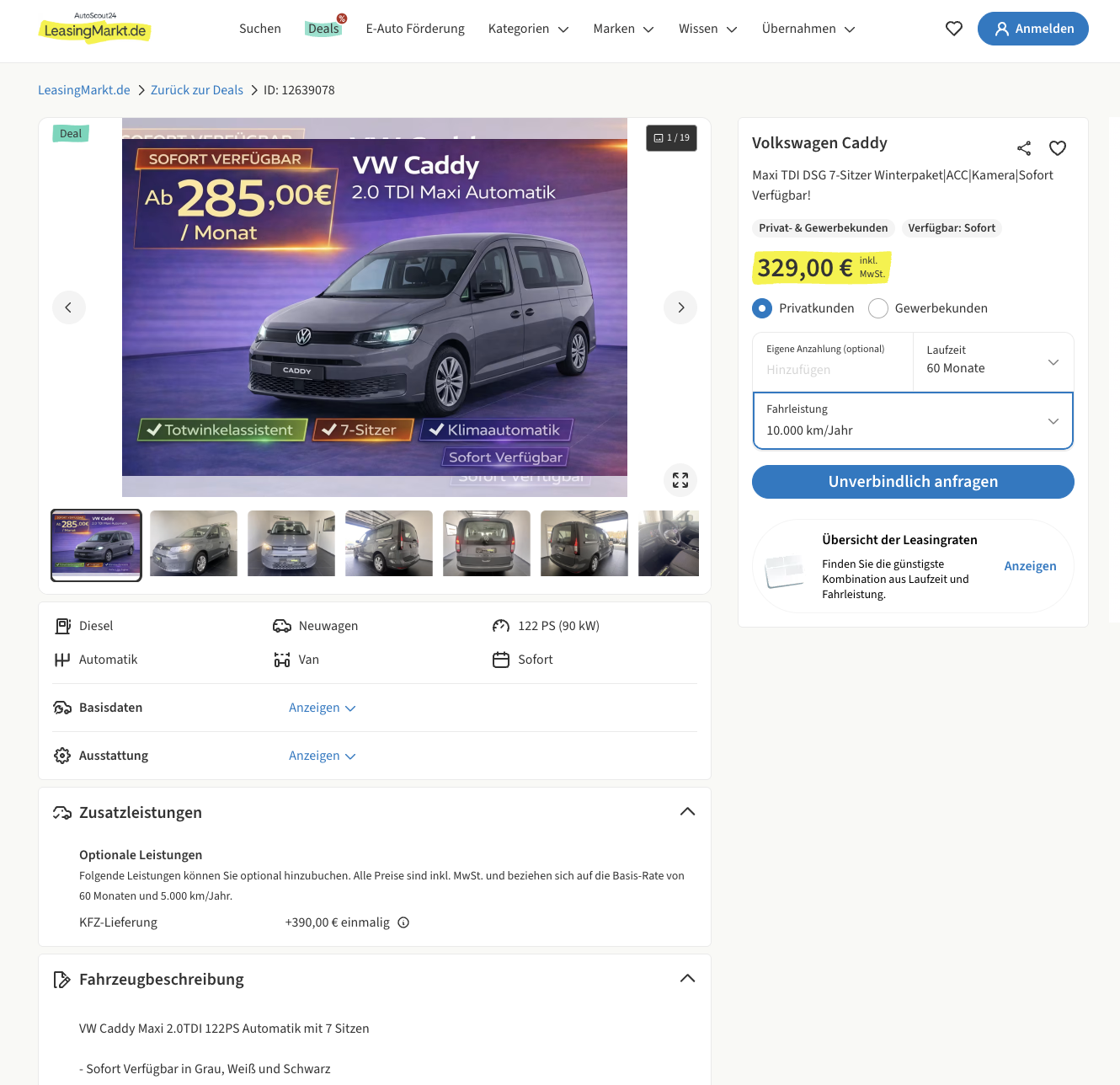 Praktischer 7-Sitzer mit sofortiger Verfügbarkeit. Sichert euch den VW Caddy Maxi 2.0 TDI DSG 7-Sitzer bei LeasingMarkt für 329 Euro brutto im Monat, damit steht ein Familienvan mit viel Platz, sieben Sitzen und sofortiger Verfügbarkeit zu einer Rate im Angebot, die im aktuellen Markt durchaus bemerkenswert ist. Erhältlich ist das Modell direkt in Grau, Weiß oder Schwarz, angesprochen sind dabei Privat- und Geschäftskunden gleichermaßen. Wer also nicht erst monatelang auf ein passendes Fahrzeug warten möchte, bekommt hier einen Caddy, der schnell einsatzbereit ist.