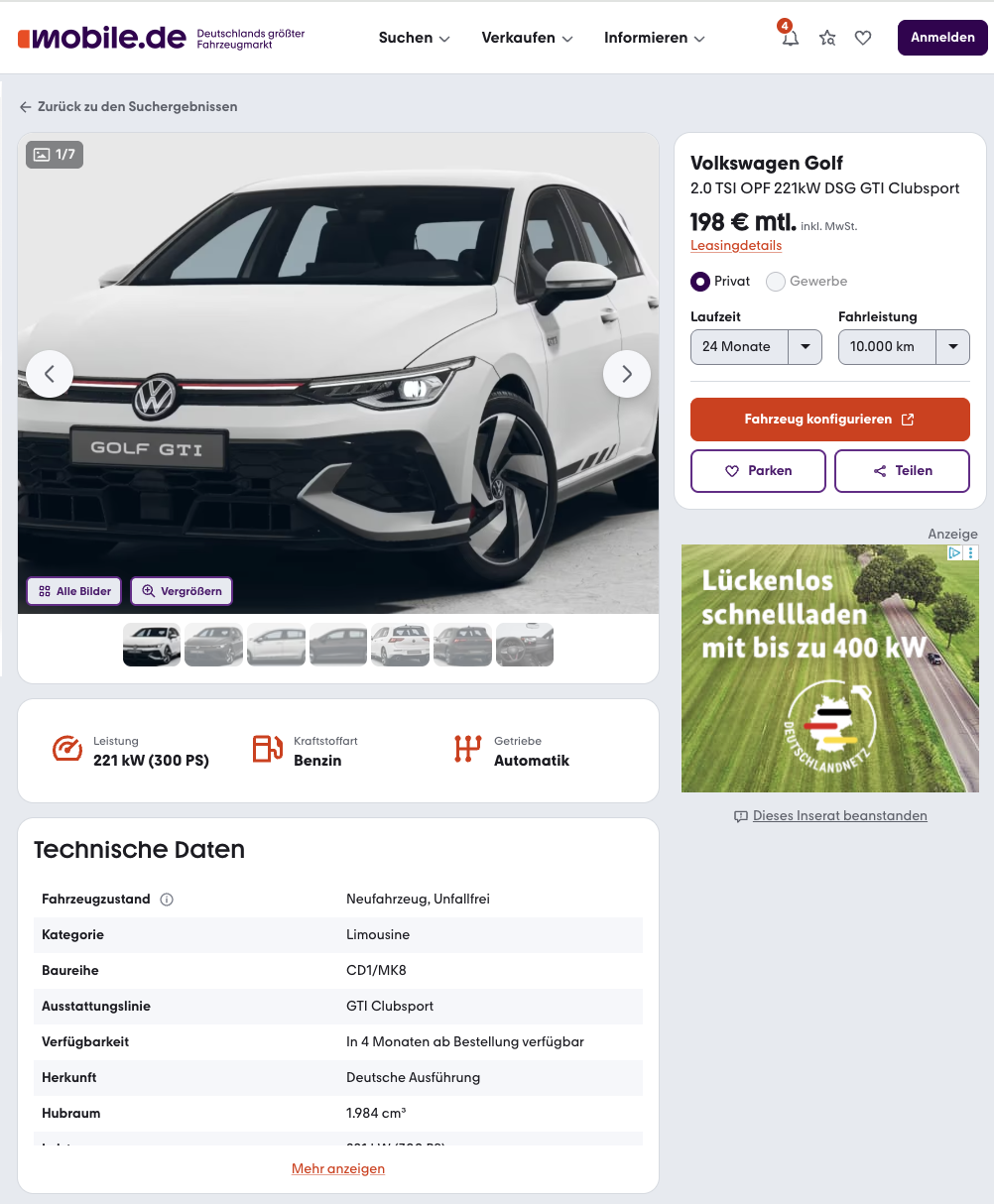 Das Leasing ist auf 24 Monate und 10.000 Kilometer pro Jahr kalkuliert. Der große Unterschied liegt im Preis, denn 198 Euro brutto sind für einen Golf GTI Clubsport sehr niedrig, insbesondere im Vergleich zu 803 Euro brutto beim Marktführer.