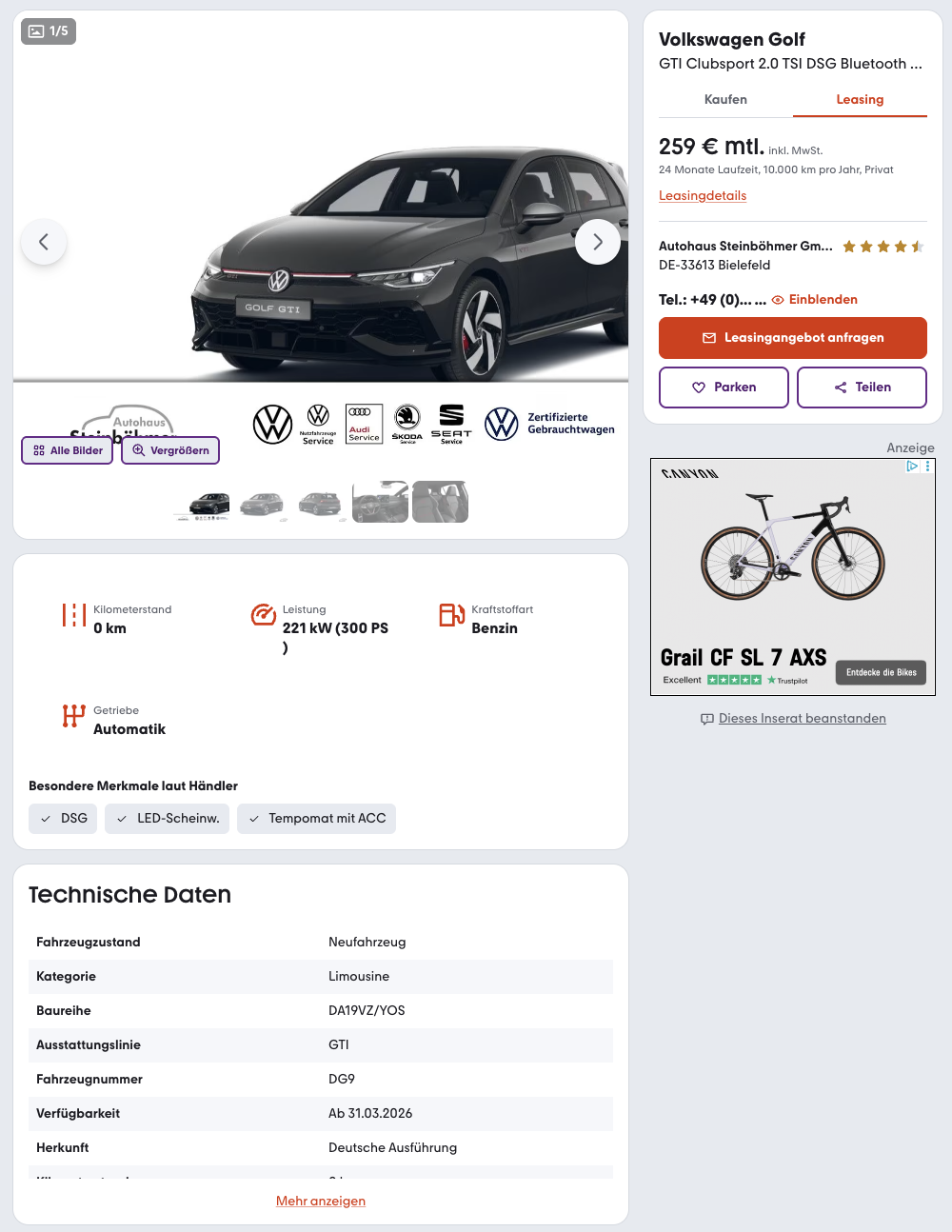 Kalkuliert ist das Angebot von mobile.de auf 24 Monate Laufzeit und 10.000 Kilometer pro Jahr. Im direkten Vergleich wird der Deal besonders deutlich. Während andere Anbieter für den VW Golf GTI Clubsport aktuell rund 672 Euro brutto im Monat verlangen, liegt dieses Angebot bei 259 Euro brutto. Der Unterschied ist erheblich und erklärt, warum der Clubsport hier nicht nur emotional, sondern auch rechnerisch überzeugt. Wer einen leistungsstarken Kompaktwagen mit echter Substanz sucht und dabei auf eine saubere Kalkulation achtet, findet hier ein außergewöhnlich starkes Leasingangebot.