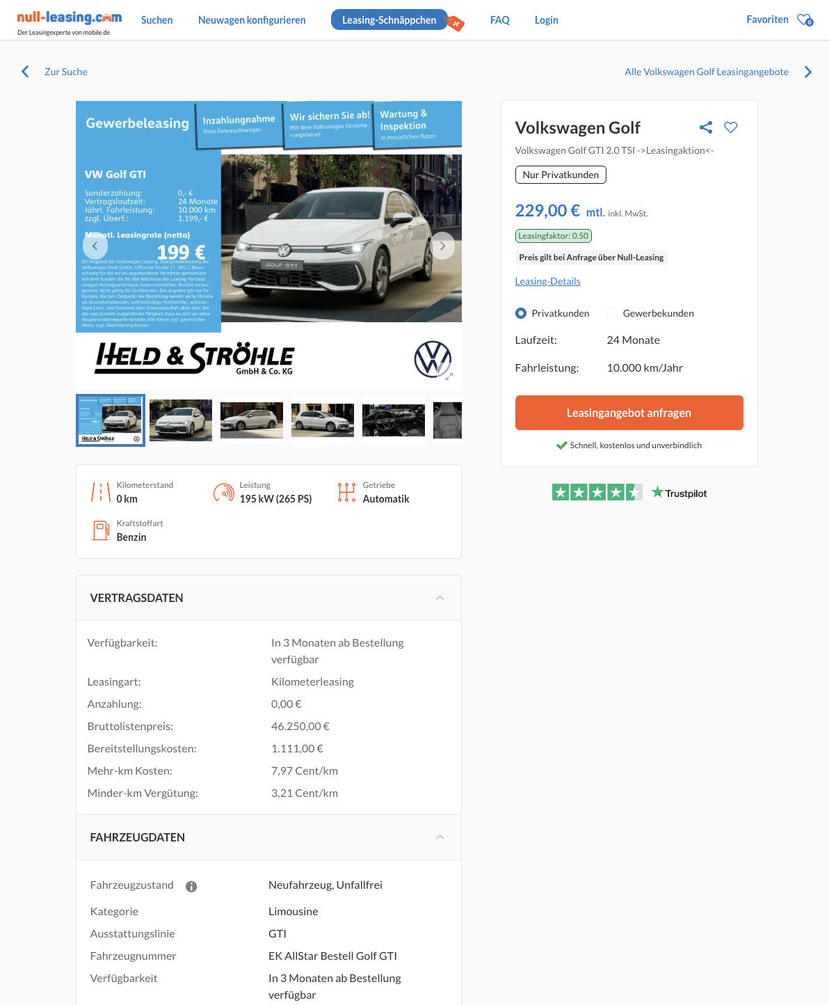 VW Golf GTI im Leasing als Bestellfahrzeug für 229 Euro im Monat brutto