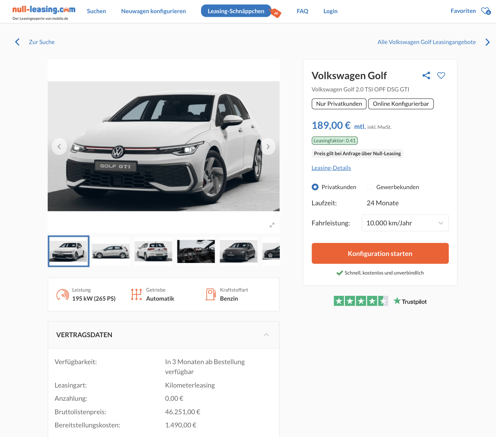 Kalkuliert ist das Leasing mit 24 Monaten Laufzeit und 10.000 Kilometern pro Jahr, Anpassungen sind möglich. Entscheidend bleibt die Rate, denn 189 Euro brutto sind für einen Golf GTI sehr niedrig. Im Verhältnis zu 746 Euro brutto beim Marktführer entsteht ein Preisvorteil, der im Segment selten so klar ausfällt.