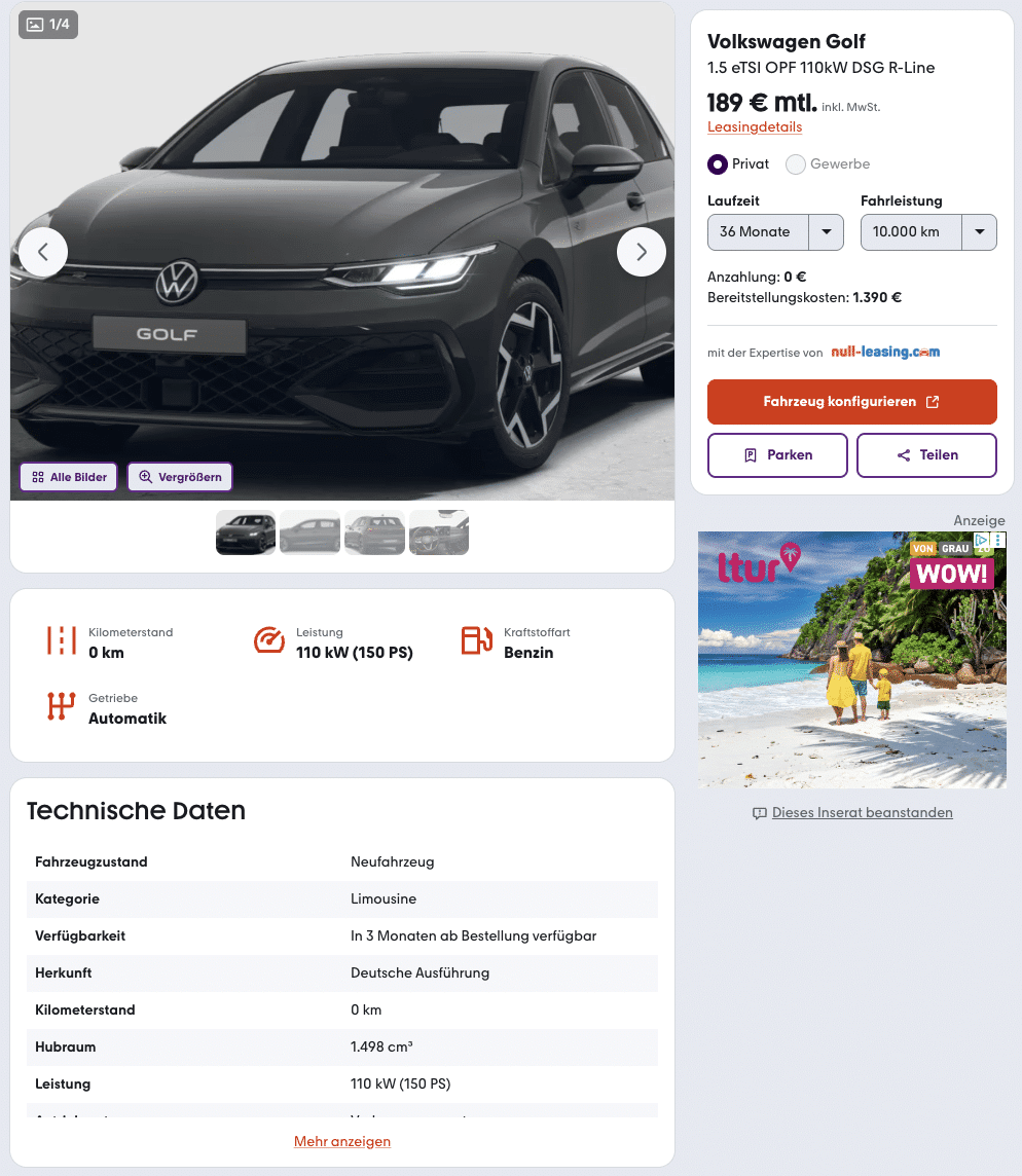 Besonders bemerkenswert, ist der Preisunterschied zum Marktführer. Dort kostet der Golf R-Line aktuell 526 Euro brutto im Monat, hier zahlt ihr nur 189 Euro, eine monatliche Ersparnis von 337 Euro oder über 12.000 Euro auf die gesamte Laufzeit gerechnet.